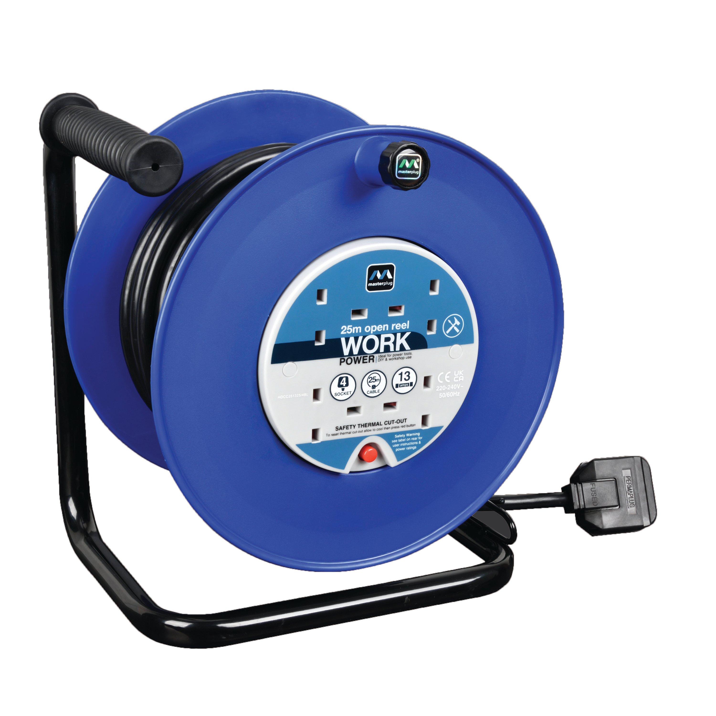 This 4 socket 40m open cable reel extension lead from Masterplug is perfect for DIY. Features include a comfortable handle, 4 shuttered sockets, and a 40-metre cable for durability and reliability. The drum winding handle ensures easy cable management, and it’s manufactured to meet strict safety standards, including a resettable thermal cut-out for added safety. The grooved handle makes lifting and transporting a breeze, and it’s built with a strong steel frame making this cable reel perfect for most electrical solutions.