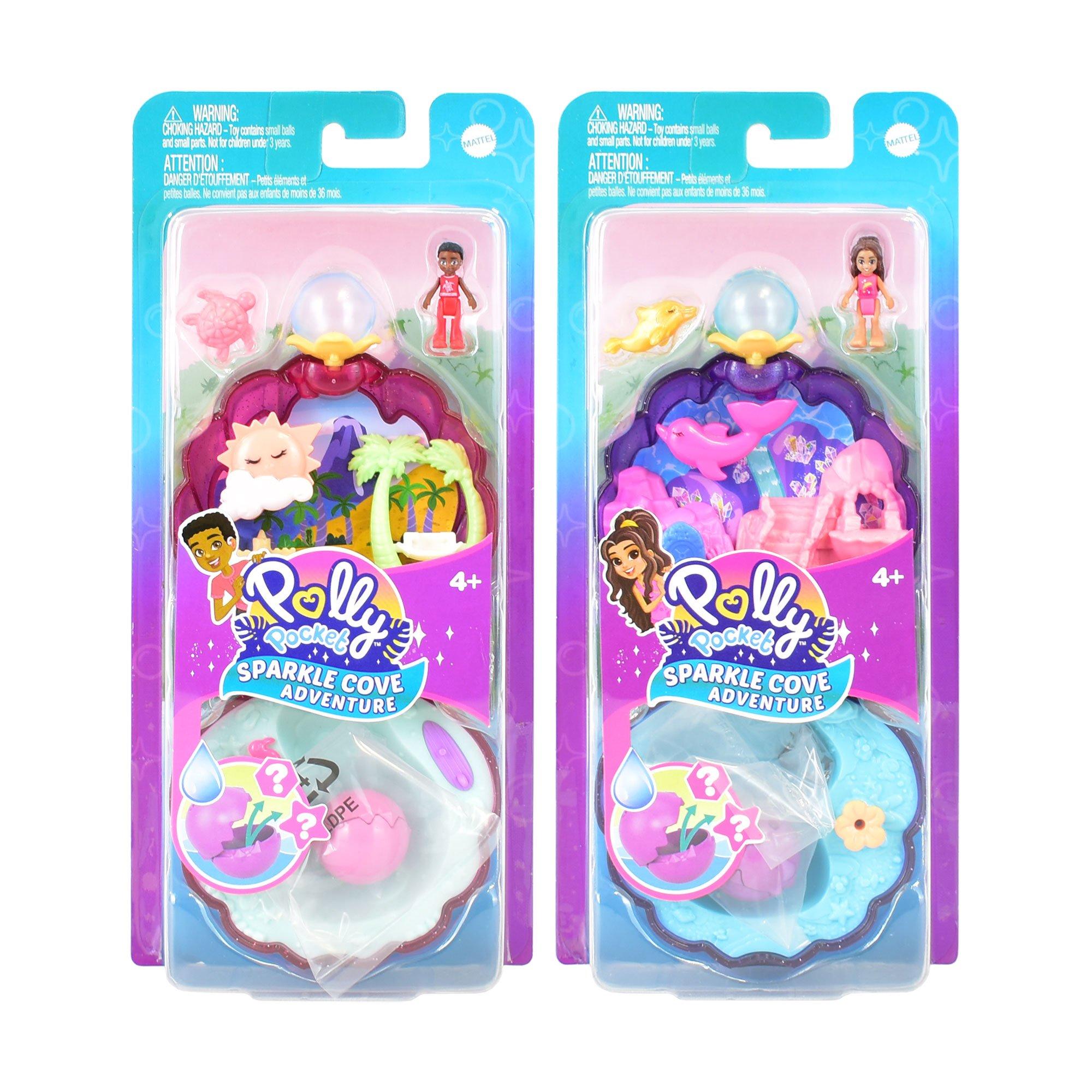 Mattel's Polly Pocket Sparkle Cove Shell Doll Set features a compact design with hidden play areas. The shell-shaped case opens to reveal a detailed interior with miniature elements for play. This engaging toy playset offers portable entertainment for kids.