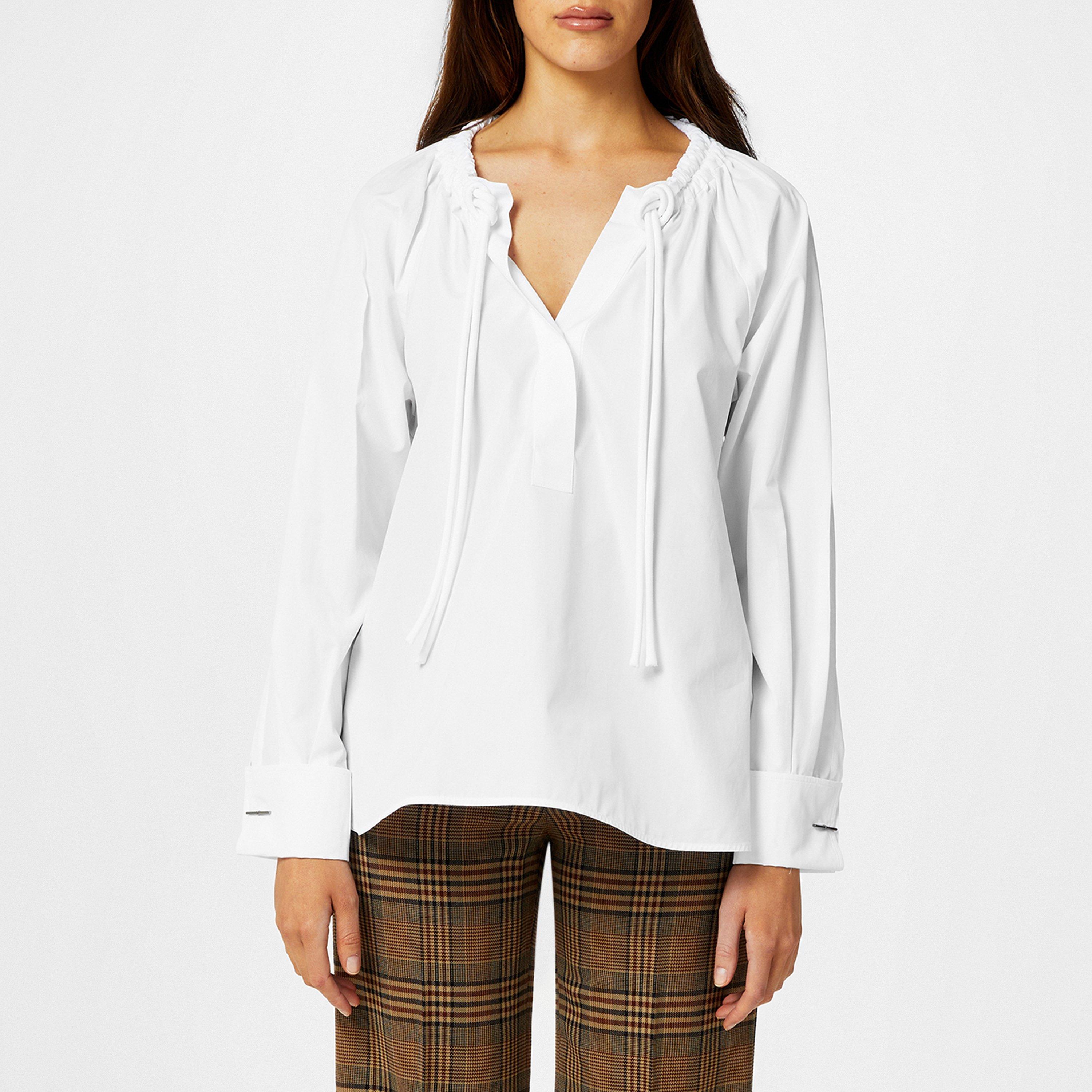 Discover the epitome of summer chic with the Ario Cotton Poplin Blouse from Max Mara, a must-have addition to your warm-weather wardrobe. Crafted from crisp cotton poplin, this long-sleeve shirt is designed with rooftop cocktails and sandy walks in mind, providing a lightweight and breathable fit that exudes effortless chic. The loose fit drapes beautifully on the body, while the ties at the neck offer versatility, allowing you to adjust the gathering of the fabric or leave it open to elegantly showcase your decolletage.
