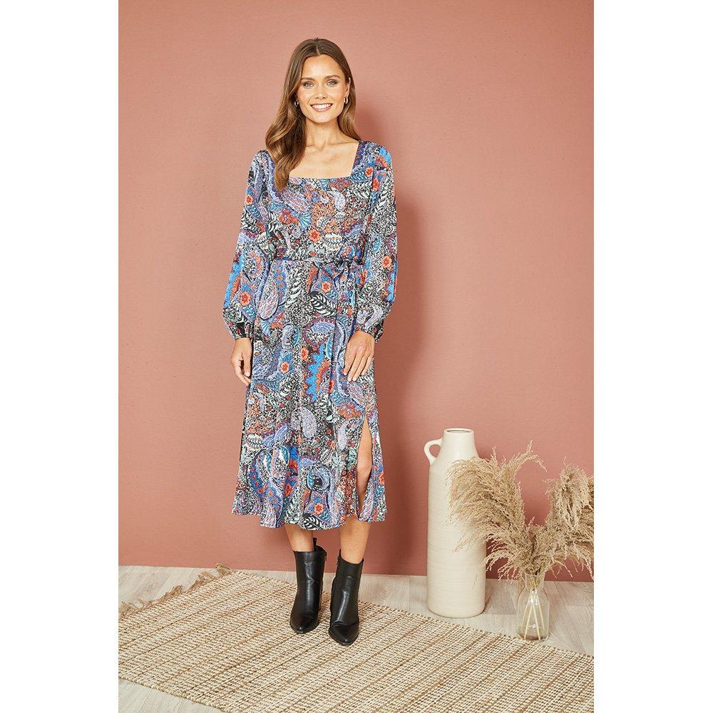 Calling all retro, boho babes, this throwback to the 70's is screaming your name! The all over paisley print is unique and super versatile, wear dressed up to fancy invites or keep in casual for brunch with your besties. The long sleeves, skater style flowy midi hem and square neckline are so flattering and will have everyone asking, where did you get that dress?!