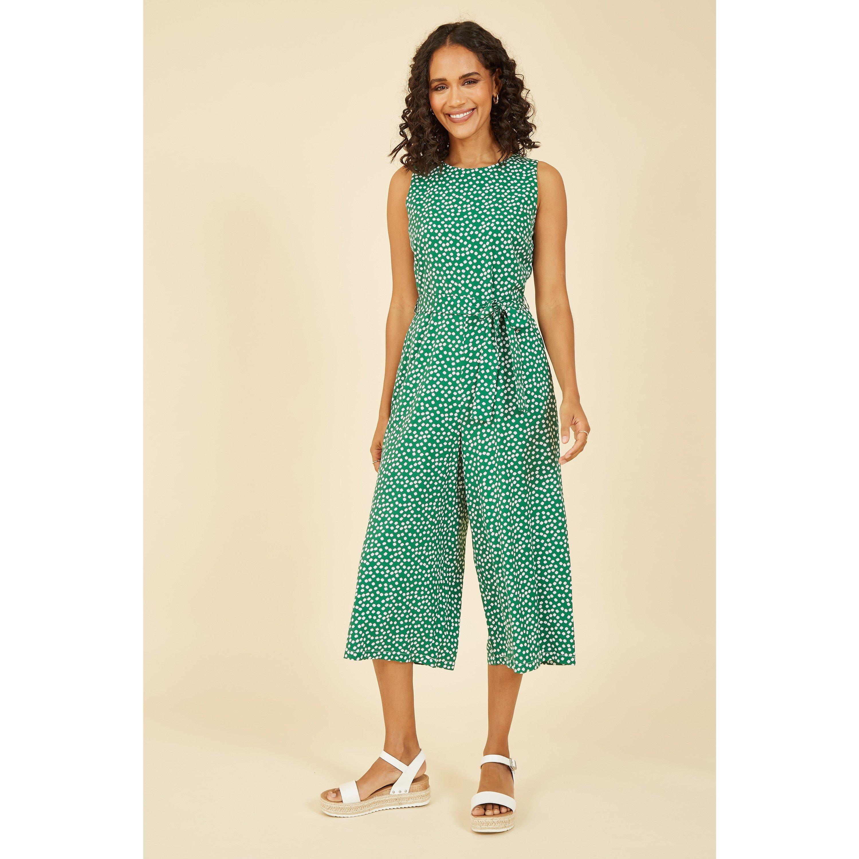 Jump into summertime in the Mela Green Ditsy Daisy Sleeveless Culotte Jumpsuit. This jumpsuit features a self tie belt to define the waist, and cropped wide leg trousers. Designed to wear work to weekend, adding comfort and style to everyday.
