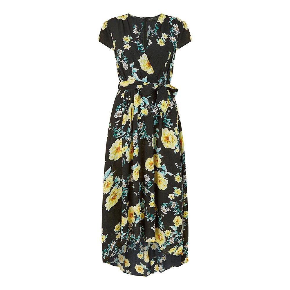/Home/Wedding Boutique/Wedding Guest/Wedding Guest Dresses/Women's Black Floral Dipped Hem Midi Wrap Dress