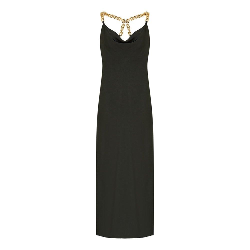 Mela London's Chain Strap Maxi Dress flows to the floor. The fabric drapes smoothly while the chain straps complement this maxi design.