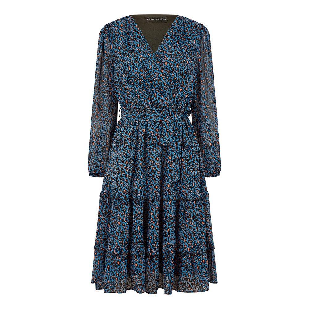 Mela London's Animal Print Midi Wrap Dress flatters the figure with its wrap design. The striking animal pattern creates visual interest against a rich backdrop.
