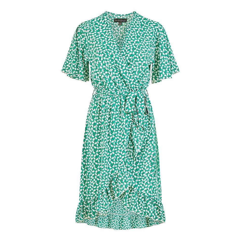The Ditsy Floral Frill Wrap Dress from Mela London presents a structured shape with a practical wrap design for women, set against a botanical print background.