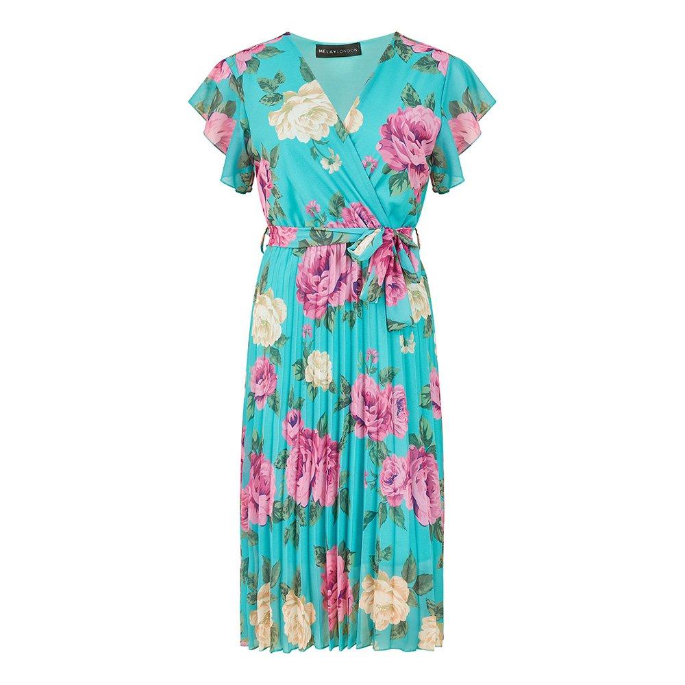 Mela London balances pattern with structure in this Floral Pleated Wrap Dress, creating a defined shape through thoughtful pleating that flatters women. The wrap style offers a flattering fit, enhanced by the structured design elements.