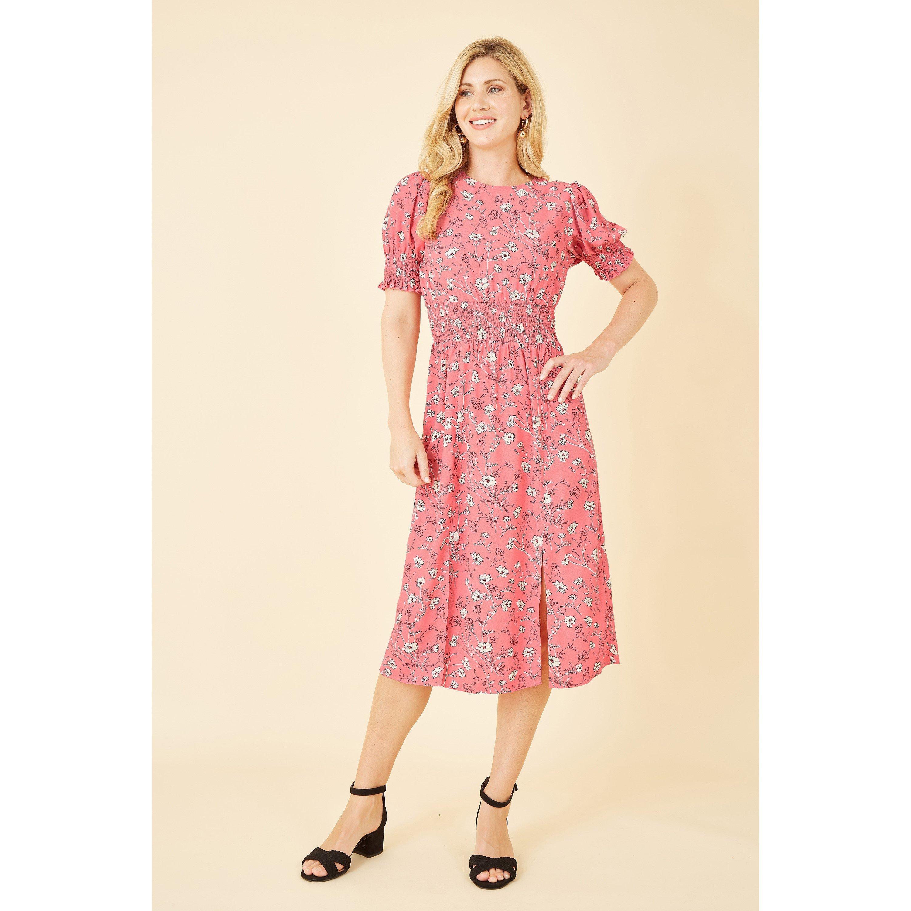 Features a flattering elasticated ruched waist and cuffed, 1/4 length sleeves, this Mela Pink Floral Shirred Waist Midi Dress is bang on trend and would make a super cute addition to any wardrobe. The hem split adds a youthful feel to this everyday dress that can be worn over and over again. Perfect matched with strappy platforms and a denim jacket.