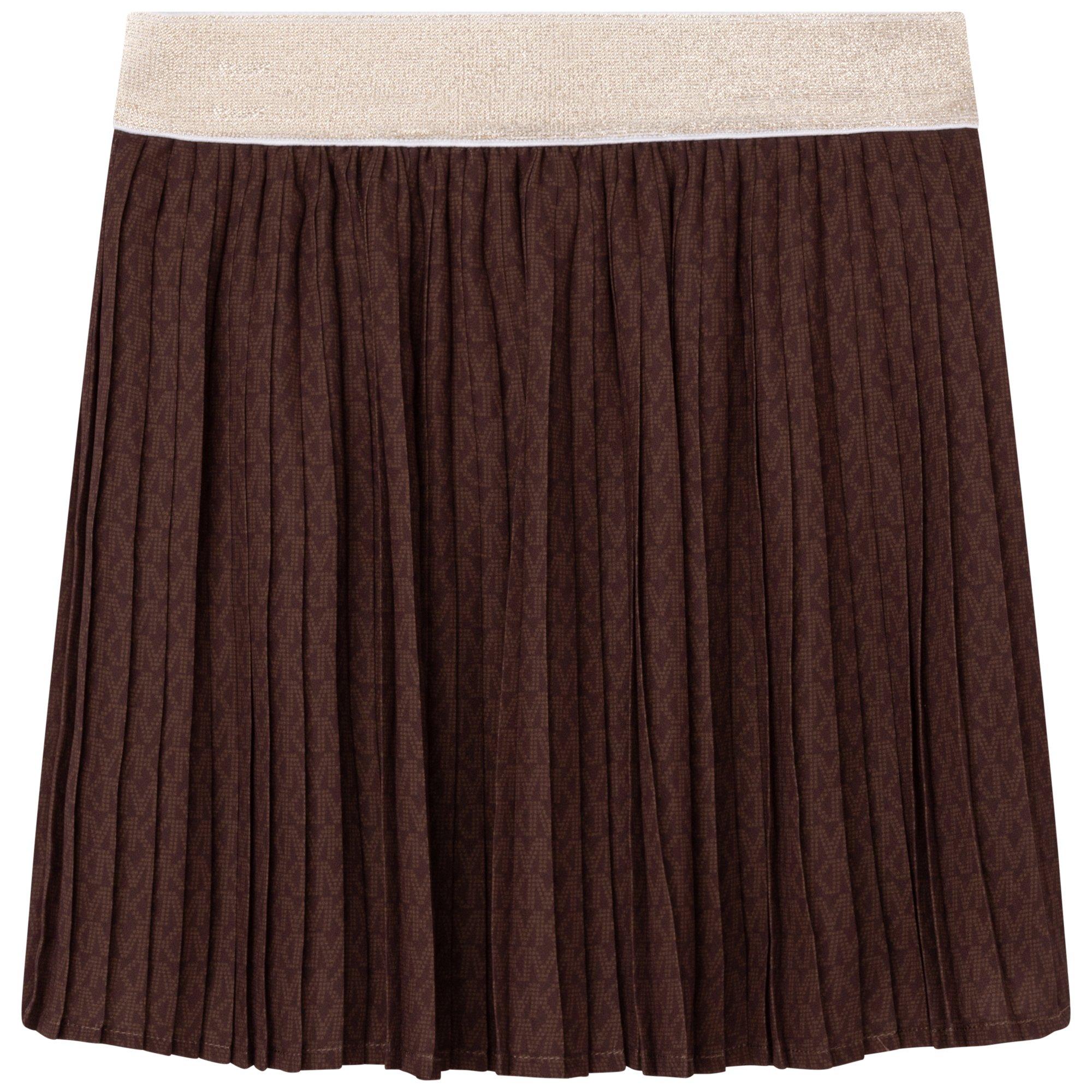 Get your little one's summer ready with the Michael Kors Girls Pleated Skirt. Crafted from a lightweight nylon jersey, this mini length silhouette boats the instantly recognisable MK print adorned all-over the plated silhouette for an on-brand aesthetic. With an elasticated metallic waistband for a secure fit, this skirt is perfect to pair with a vest and sandals for a day to evening look.
