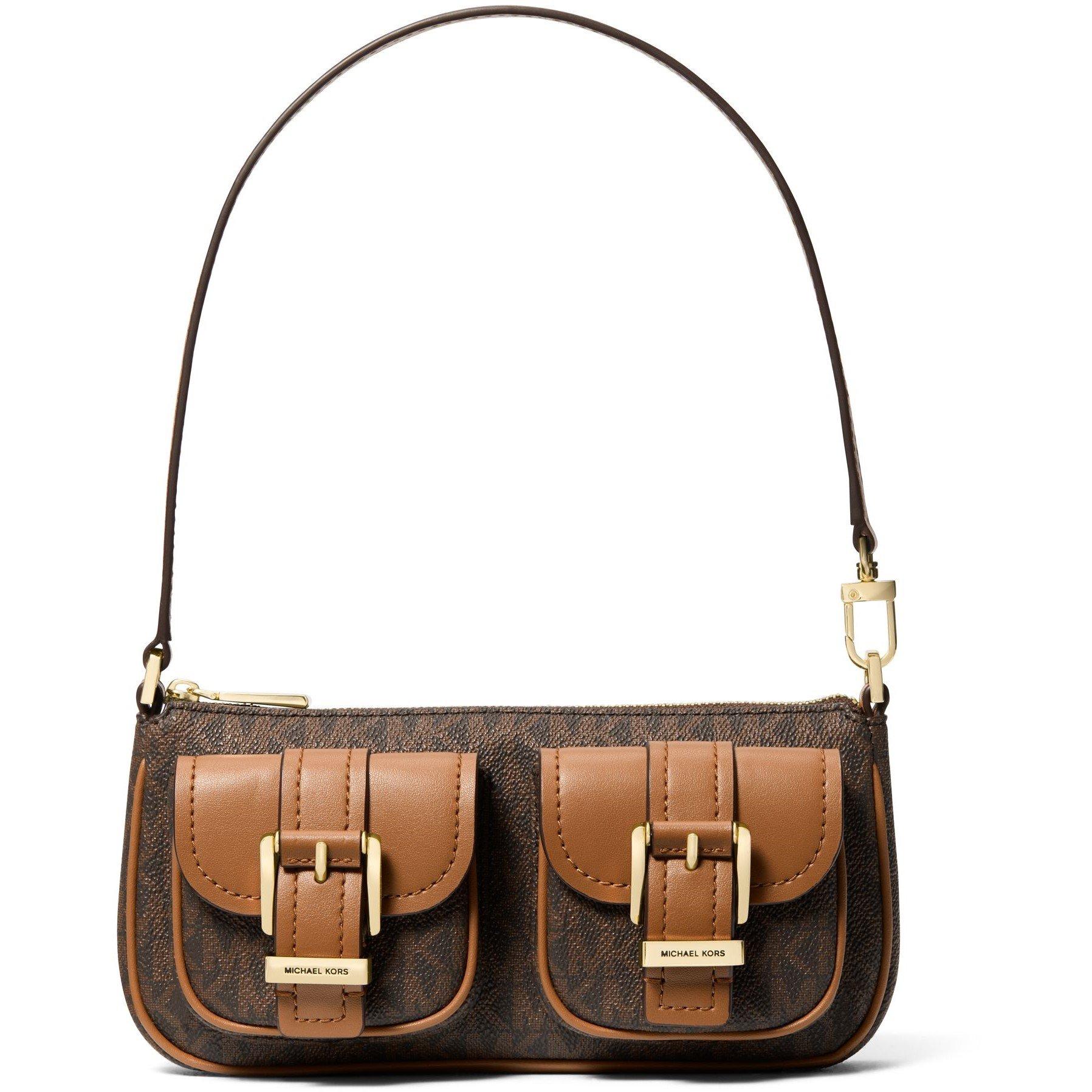 The Zoe Small Logo Shoulder Bag from MICHAEL Michael Kors showcases the brand's logo pattern across a compact designer handbag, finished with hardware and a chain strap.