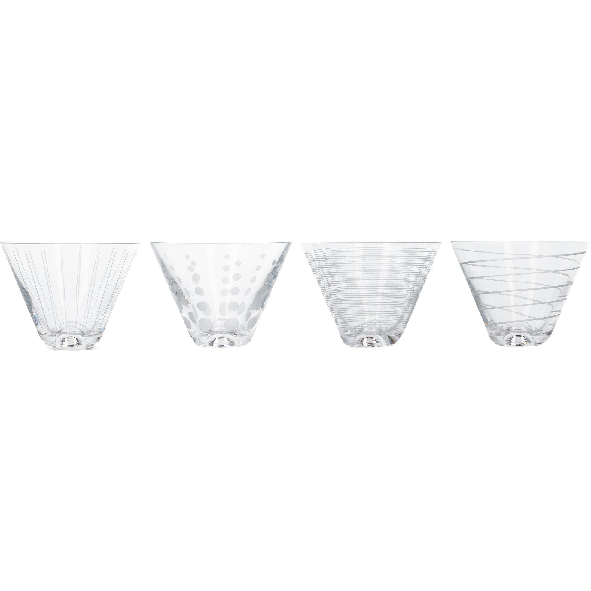 Party in style with this set of four stemless martini glasses from tabletop industry leader Mikasa. Be unique with precision-etched designs in a sophisticated, coordinating collection. Made of stunning crystal glass, each martini cocktail glass is decorated with its own distinct, celebration-ready design. Guests will be delighted when you serve them their favourite martini cocktail in their own glass, etched with shimmering silver sweeps, loops or dots. They're stemless too, so there's less chance of them being knocked over. You don't have to save them for parties, though. Bring them out when you've got friends or family round for casual cocktails, too, or celebrating the little things in life with a loved one. This set comes in a beautiful gift box, making it a wonderful gift for anyone who loves to entertain, or who simply appreciates elegant glassware.