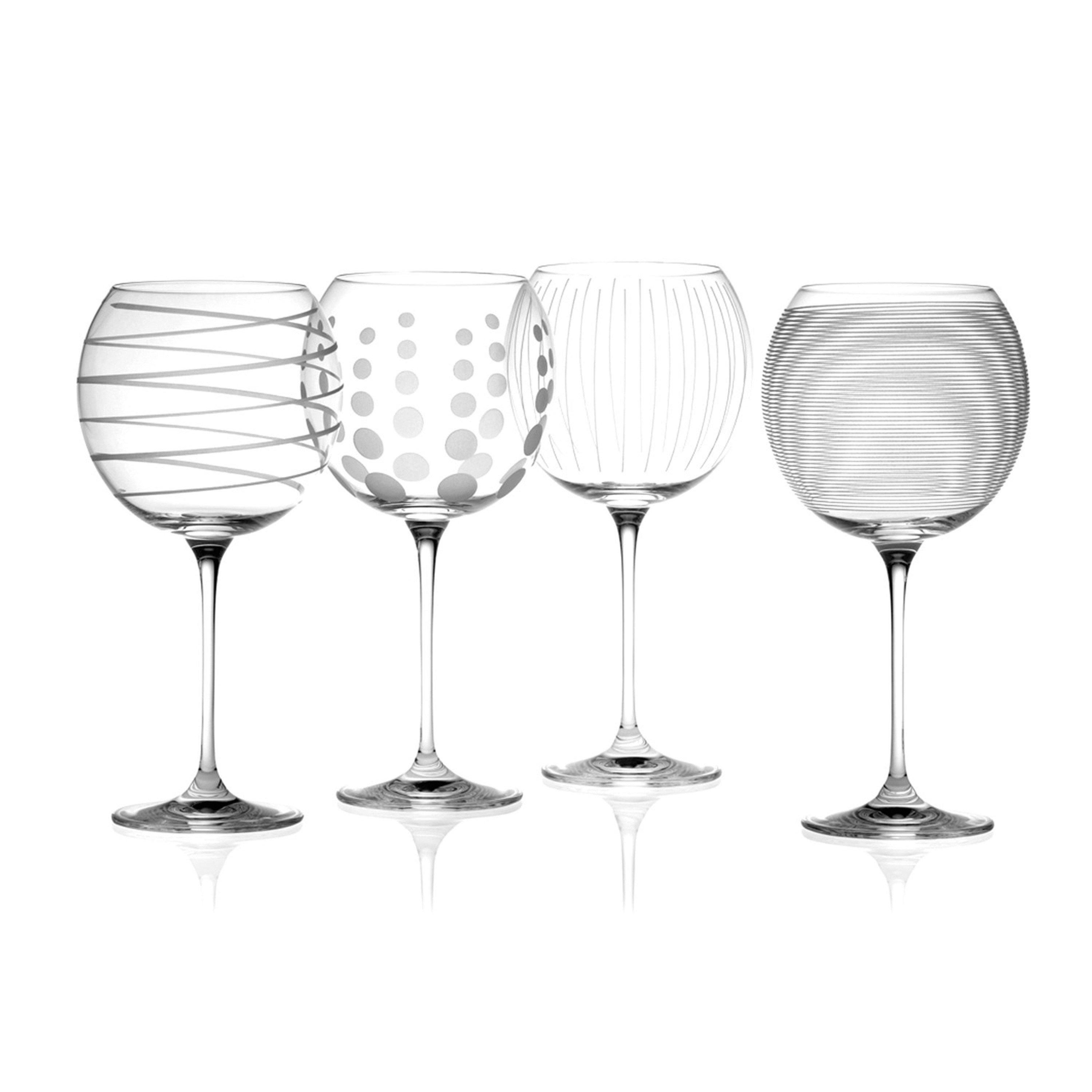 Party in style with this set of four entertaining glasses from the Mikasa collection. There's 4 different precision-etched designs, so each guest can be unique without needing a good memory, or wine charms!