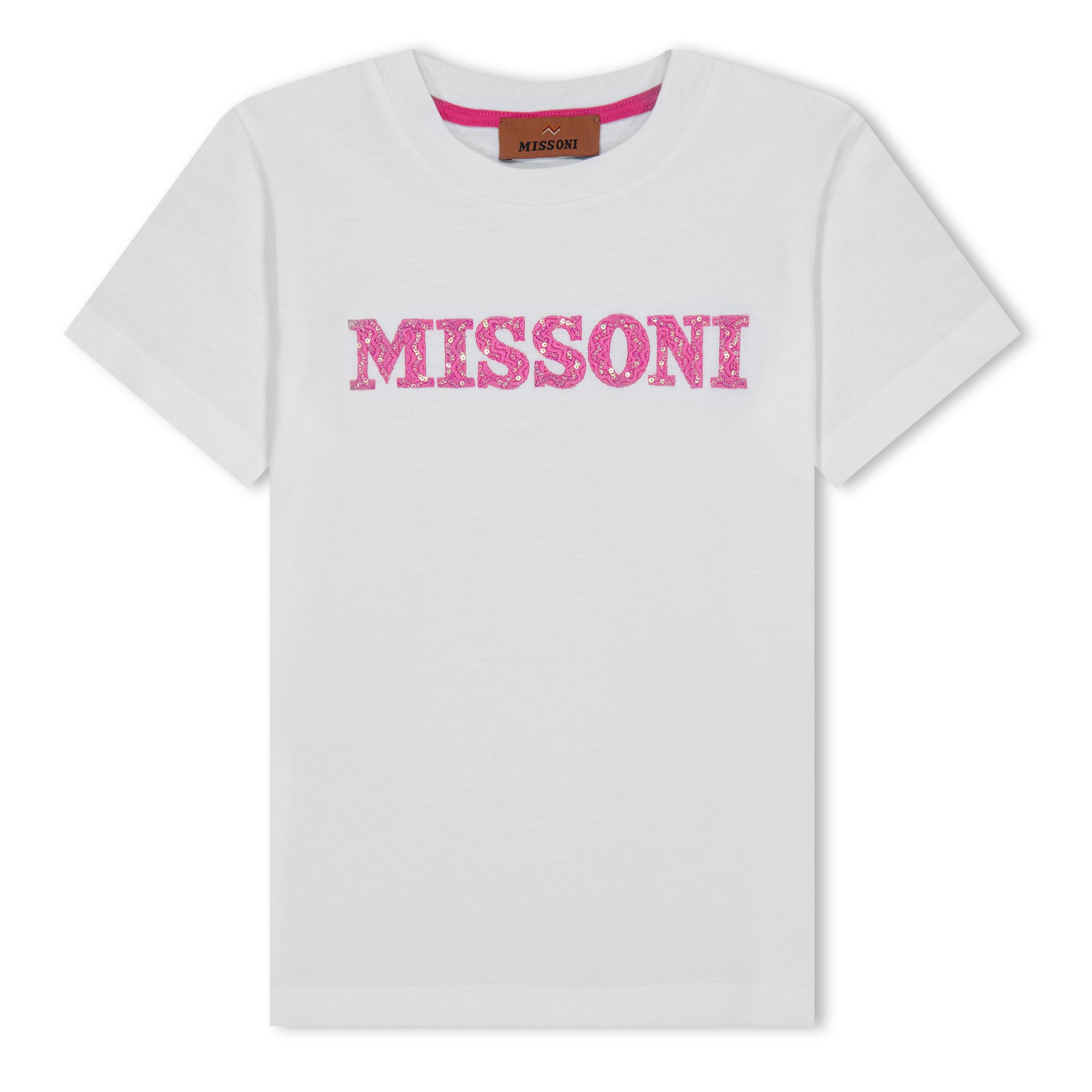 The solid base colouring of this casual top highlights the contrasting Missoni logo embroidered on the chest and embellished with sequinned detailing. Whether she is sleeping over at a friend's or doing her homework, Missoni's Embroidered Logo Sequin T-Shirt is the perfect way for her to make a statement.