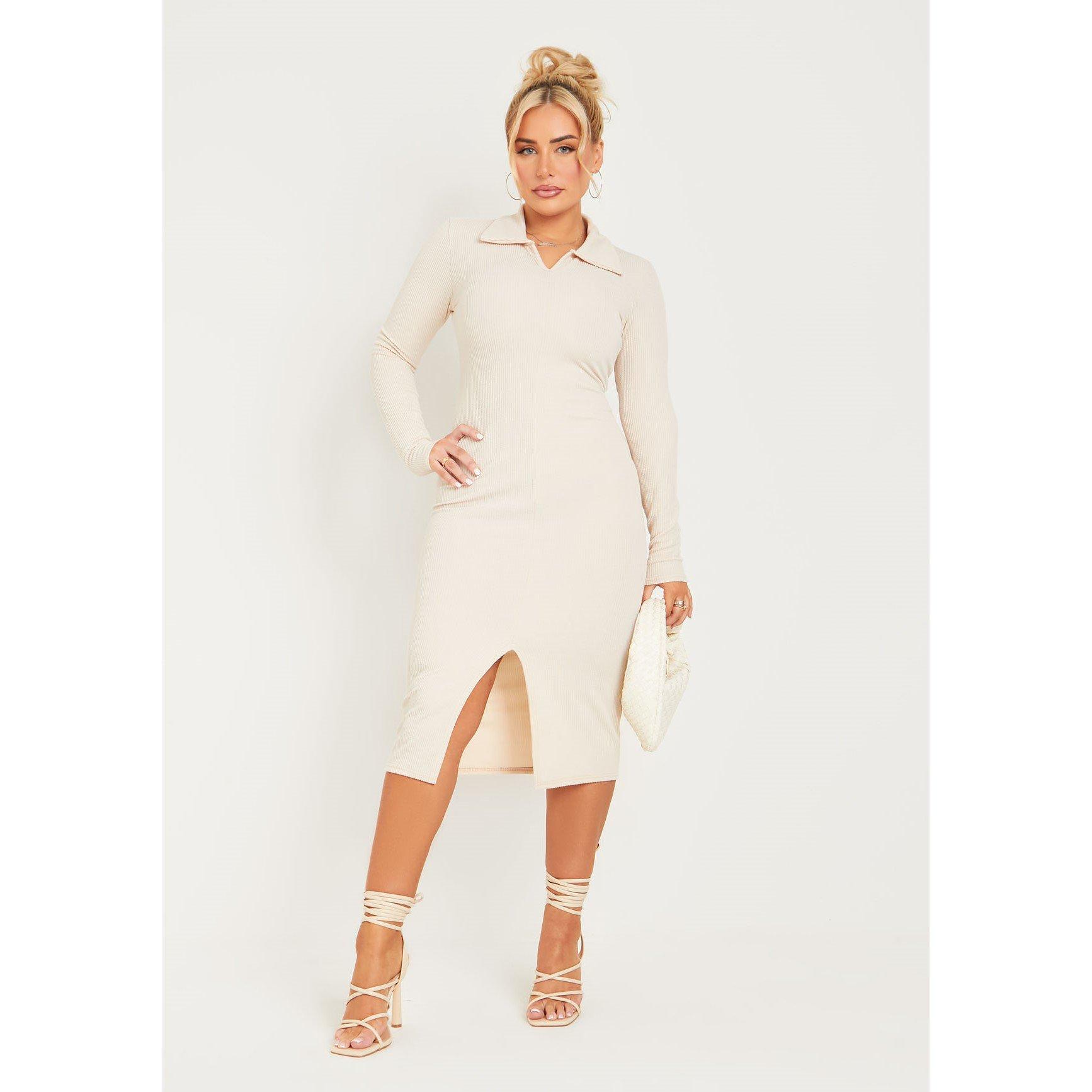 Sophisticated and sexy in our Crinkle Rib Long Sleeve Collared Midi Dress, featuring a crinkle rib material and collar detail in a bodycon fit. Grab your heels babe!