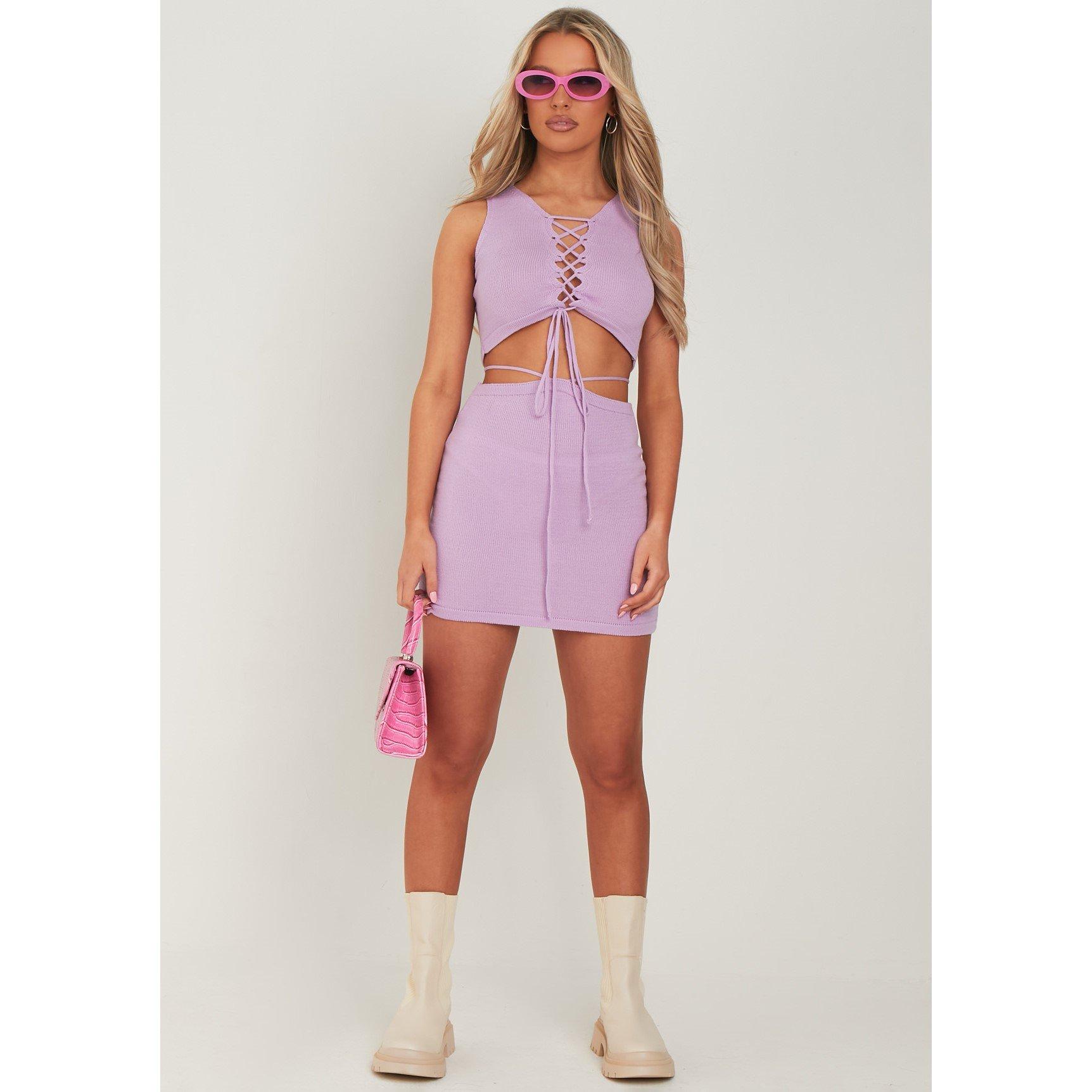 Get the festival fits ready babe, our Knitted Mini Skirt will make the coolest co-ord when paired with the matching top. Add the pop of colour in this lilac knit that features a tie up detail in a mini length. Adorable!