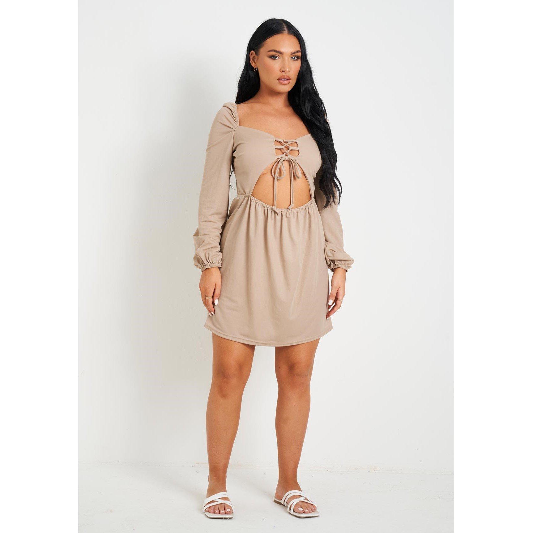 A must have summer essential, our Lace Up Front Cut Out Long Sleeve Dress. This buttermilk coloured dress has a lace up cut out front with long sleeves. We're thinking day drinks in the sunshine vibes.