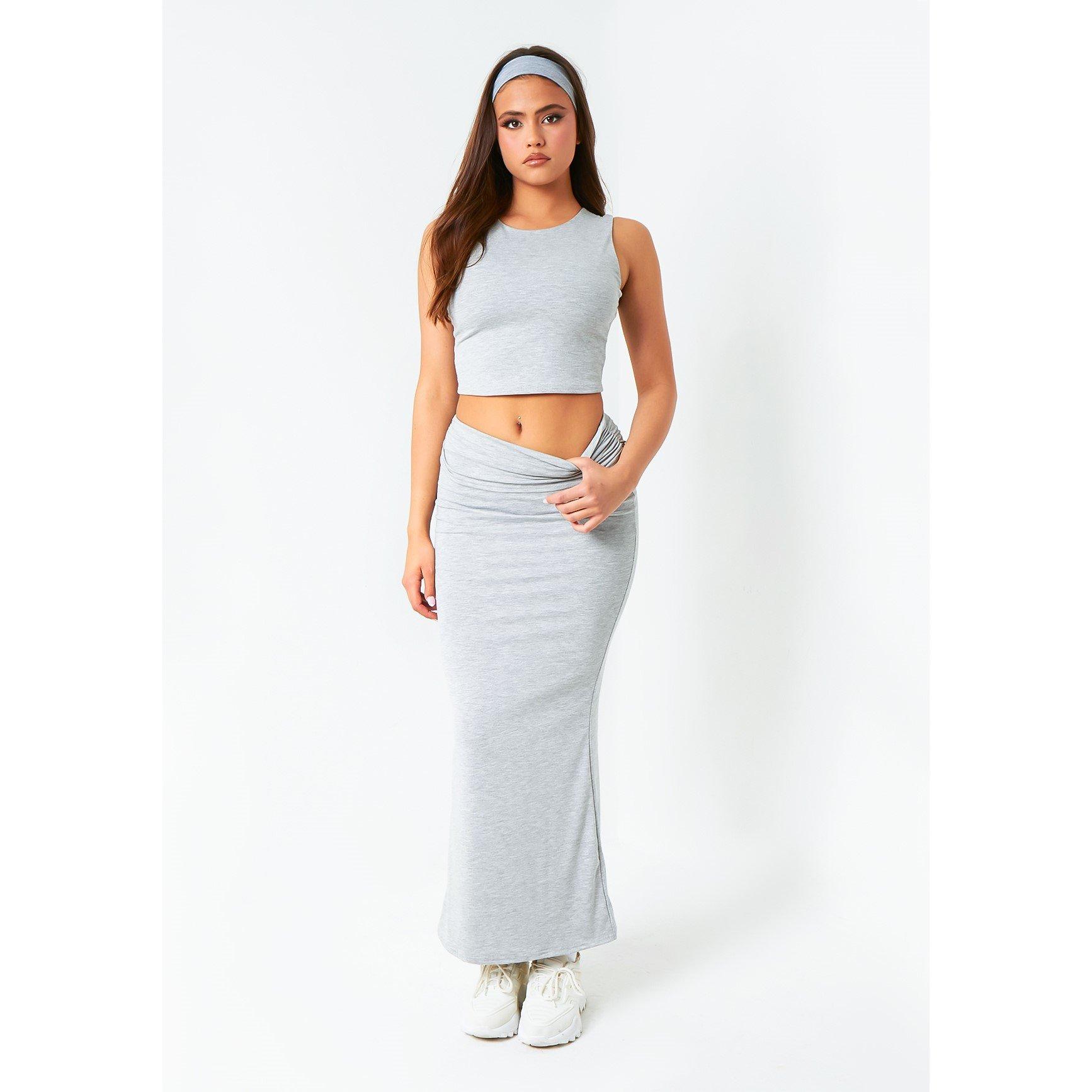 Soft Fold Over Maxi Skirt: Effortless elegance meets ultimate comfort in this versatile maxi skirt. Featuring a soft, light grey fabric and a fold-over waistband, it offers a flattering silhouette that can be styled for both casual and dressy occasions. Elevate your wardrobe with this essential piece, perfect for adding a touch of understated sophistication to any ensemble.