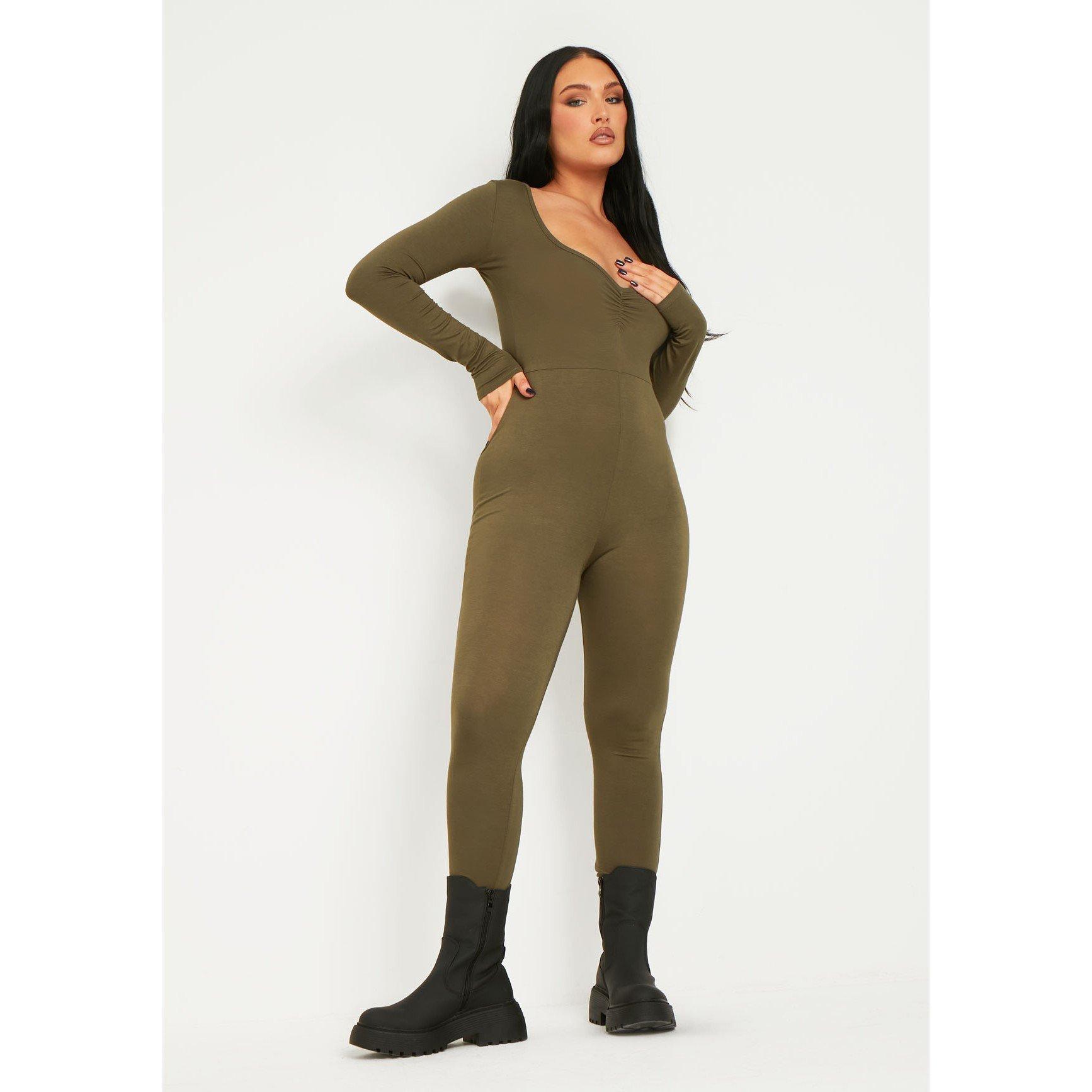 We are loving this jumpsuit for any occasion. Our Wide Neck Jumpsuit features a khaki material with a wide neck style and a figure-hugging fit.