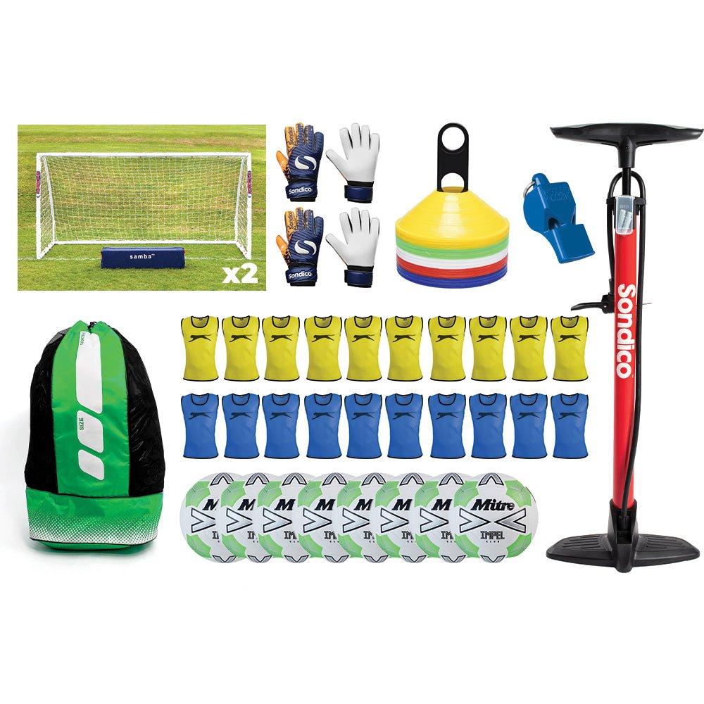 []Contents:[]10 x Slazenger Bib Yellow[]10 x Slazenger Bib Blue[]8 x Mitre Impel Club Football White[]2 x uPVC Goal (12ftx6ft)[]2 x Sondico Blaze Goalkeeper Gloves[]1 x Space Markers - Set of 50[]1 x Sondico Stirrup Pump[]1 x Mesh Ball Carry Sack[]1 x Fox 40 Whistle Blue