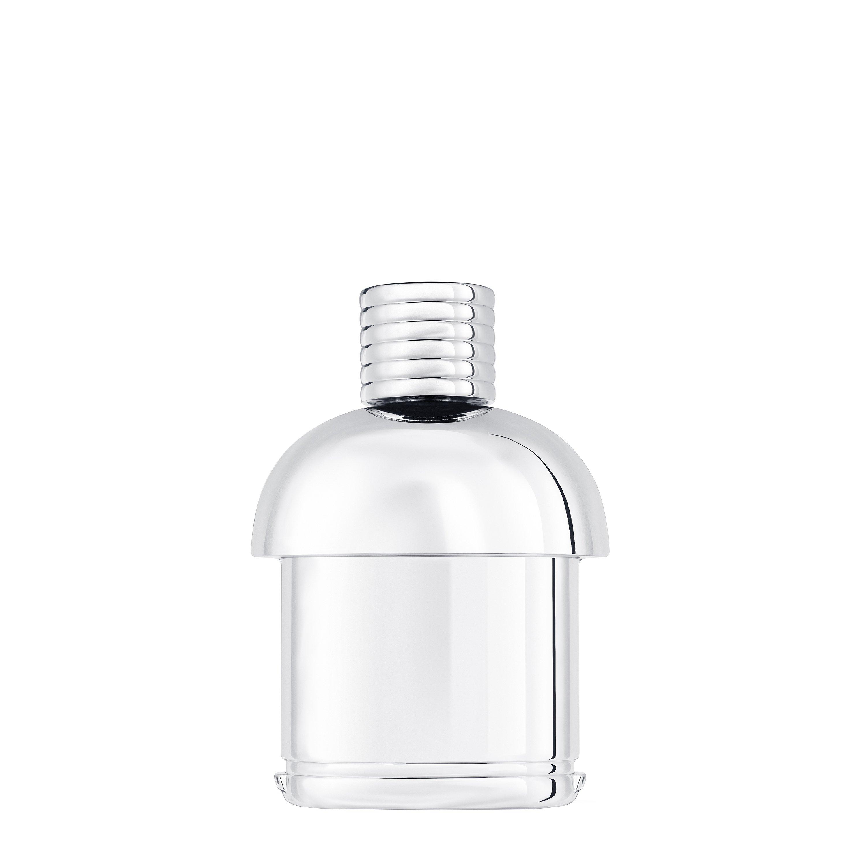 The 150ml refill is designed for the unique 'borraccia' flask-shaped bottle, reflecting Moncler's mountaineering heritage with its ribbed silver case design