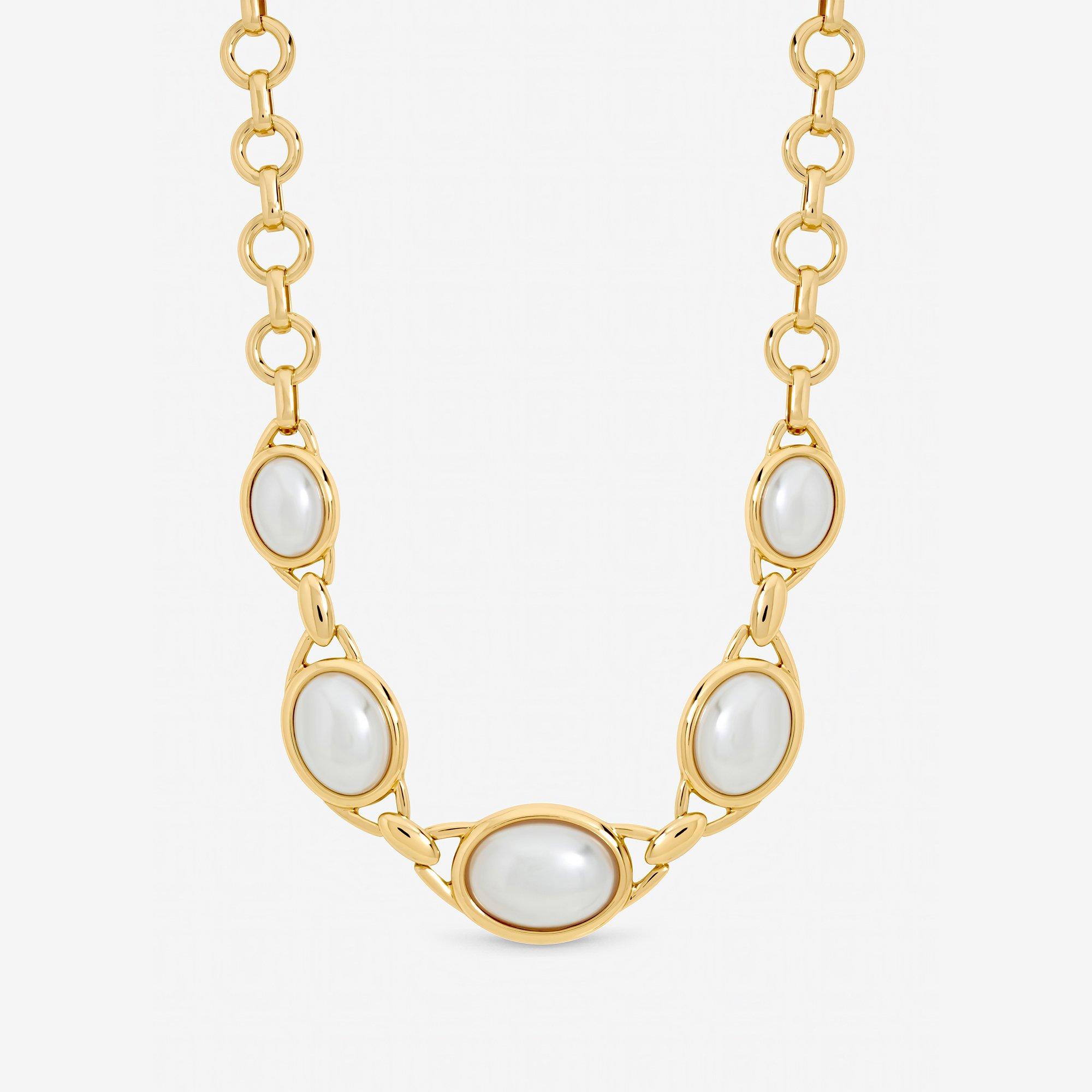 Our Mood Gold Plated and Pearl Statement Necklace is a striking piece features lustrous pearls set against a radiant gold-plated finish, creating a dramatic yet elegant design that instantly elevates any outfit. Fastening: Lobster clasp. Chain length: 16, extender length: 2. Width dimension: 22mm, length dimension: 406mm. Material: Gold plated base metal.