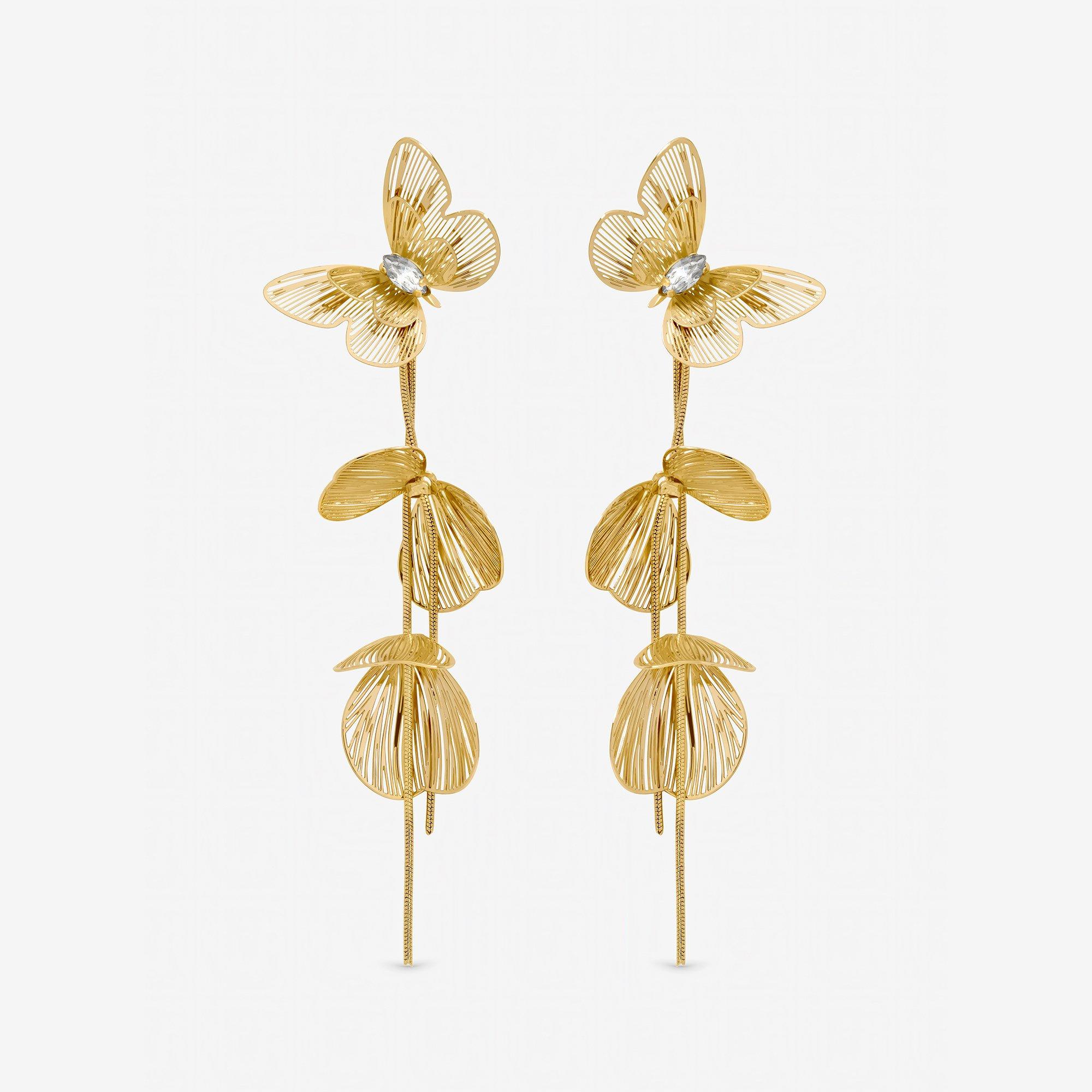 Our Mood Gold Plated Buttefly Drop Earrings are a must have this season, featuring a delicate blend of golden shine and whimsical charm. Designed to sway gently with your movement, these butterfly-inspired drop earrings add a soft, radiant touch to any look. Fastening: Post and bullet back. Width dimension: 23mm, length dimension: 40mm. Material: Gold plated base metal.