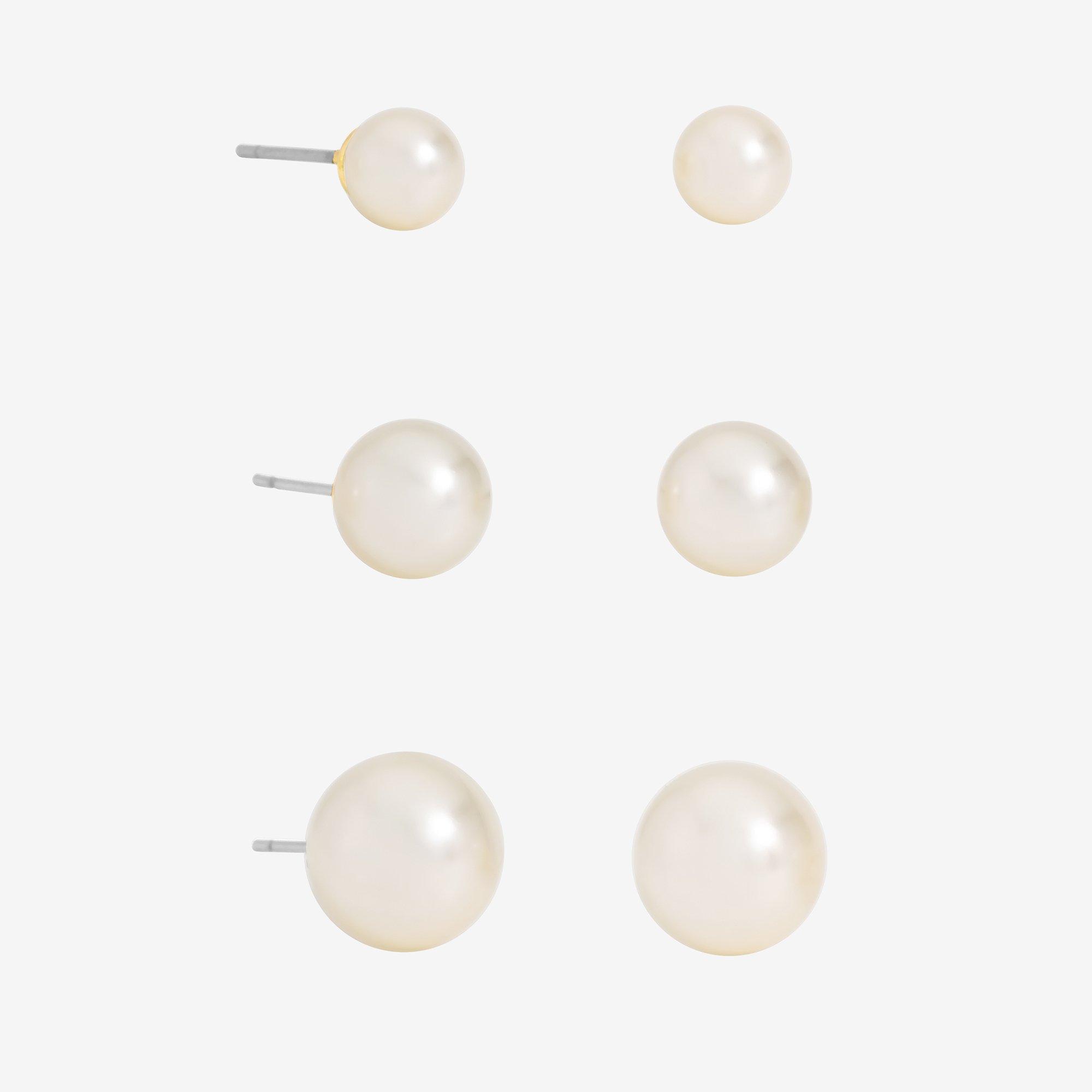 Our Mood Pearl Stud Earrings are the perfect trio of shine and style. Featuring a shimmering pearl these studs add a touch of sparkle to any outfit. Delicate, timeless, and effortless, perfect for day to night. Wear them solo or mix and match. Fastening: Post and Bullet Back. Width dimension: 6mm,8mm,10mm. Length dimension: 6mm,8mm,10mm. Material: Silver Plated Base Metal.