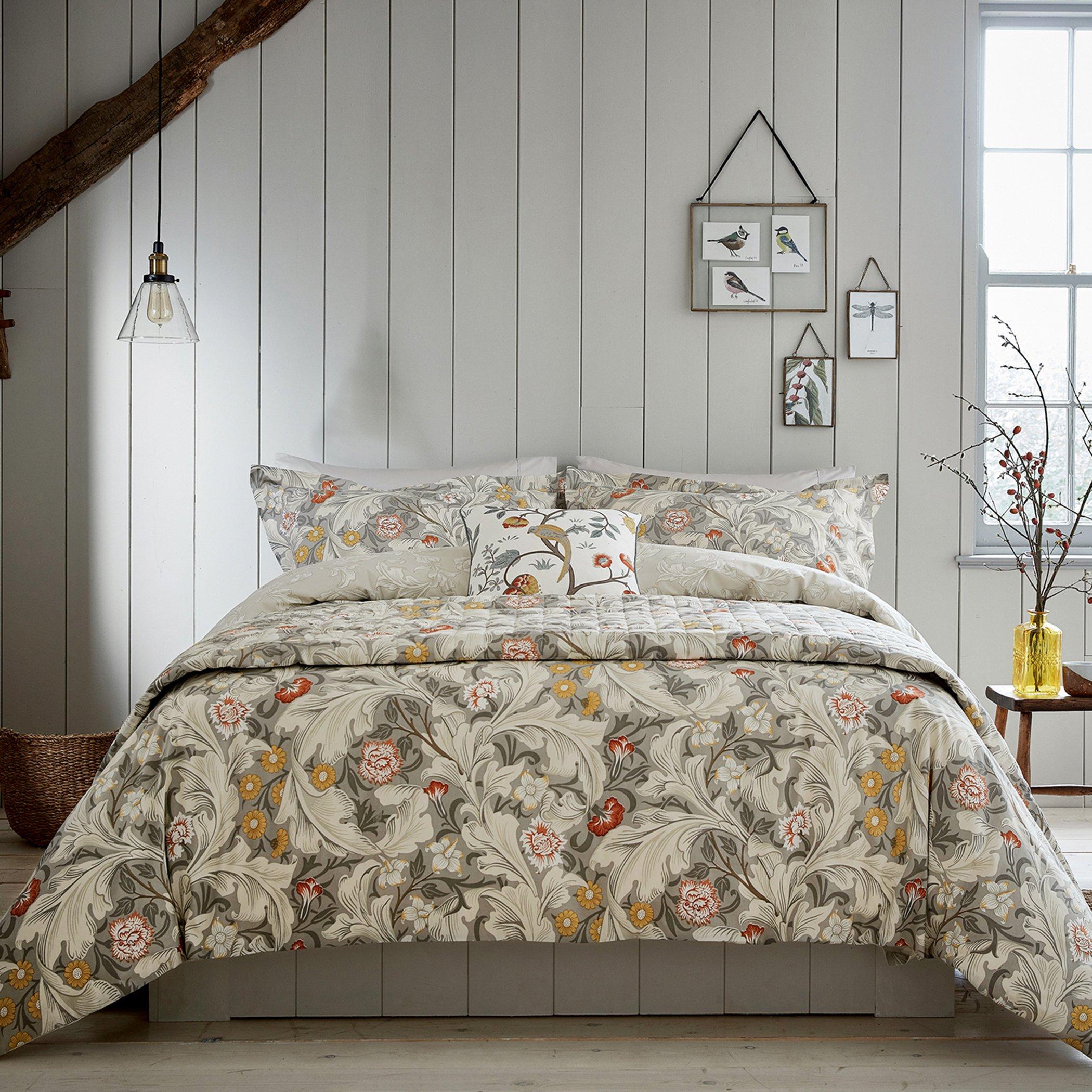 Reflecting Morris’s love of nature, Leicester features a colourful print of large scale scrolling acanthus leaves over a ground of flowers and foliage. Printed on 180 thread count cotton percale, the duvet cover and Oxford pillowcase reverse to a smaller scale leaf print in natural tones.