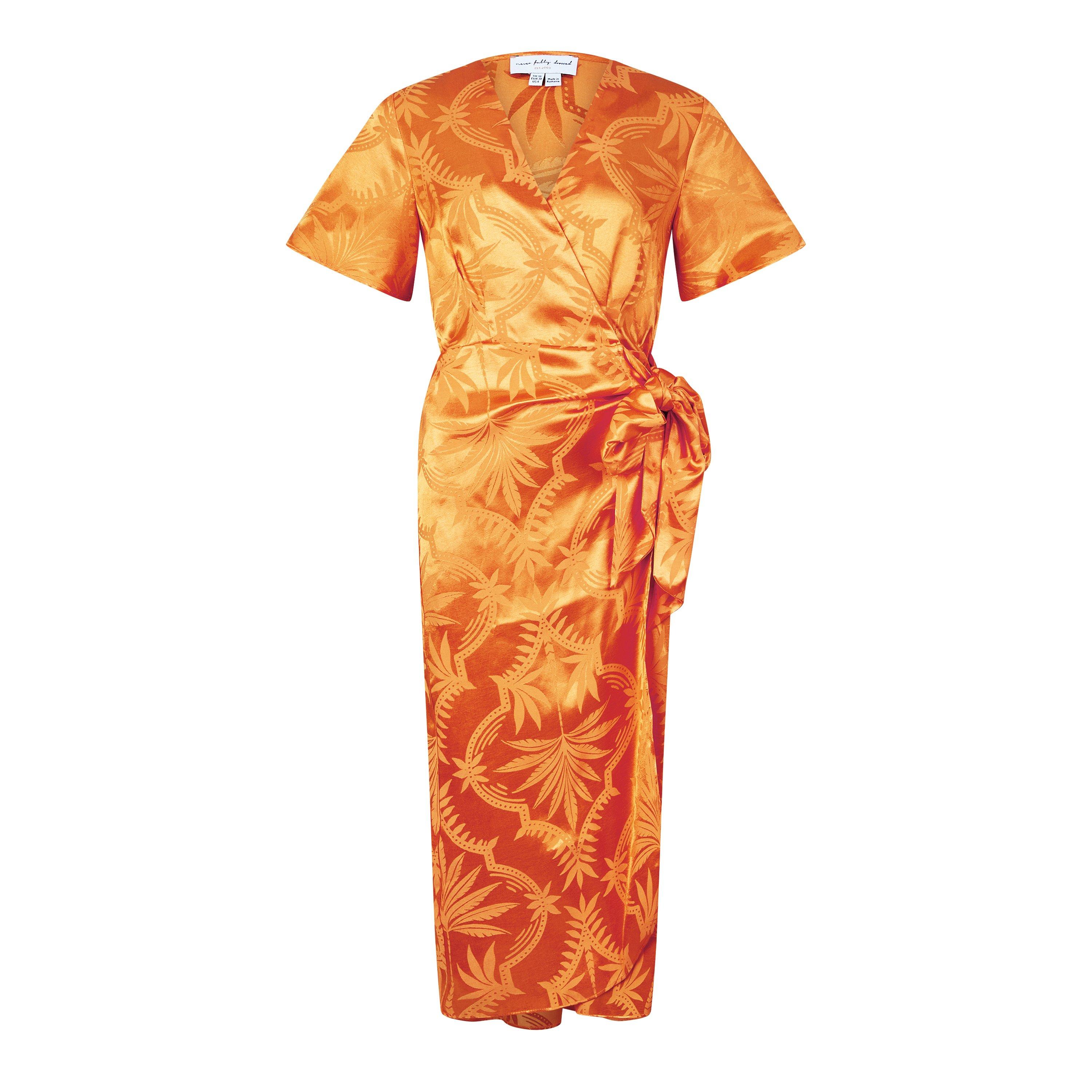 Featuring short floaty sleeves and a plunge neckline, the self-tie fastening around the waist accentuates your waistline beautifully. Presented in a refreshing spin on some of the designer's previous summer winners in a vibrant yellow and orange palette, the iconic palm tree print completes the stunning midi dress.