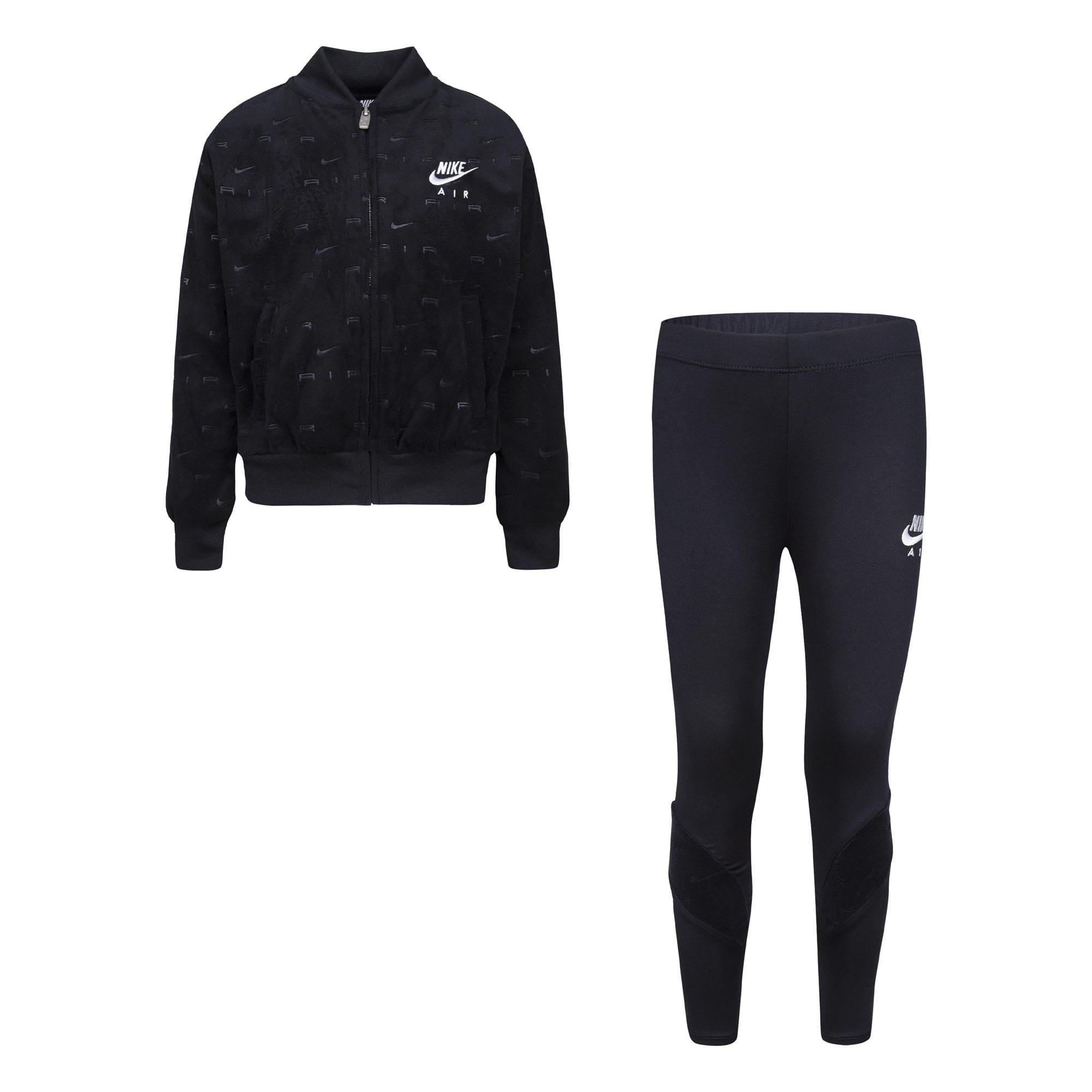 Jacket: Full-zip closure ribbed collar and cuffs front pockets and a repeat Air logo pattern. Leggings: Sport leggings with an elasticated waistband and the Nike Swoosh logo on the lower leg.