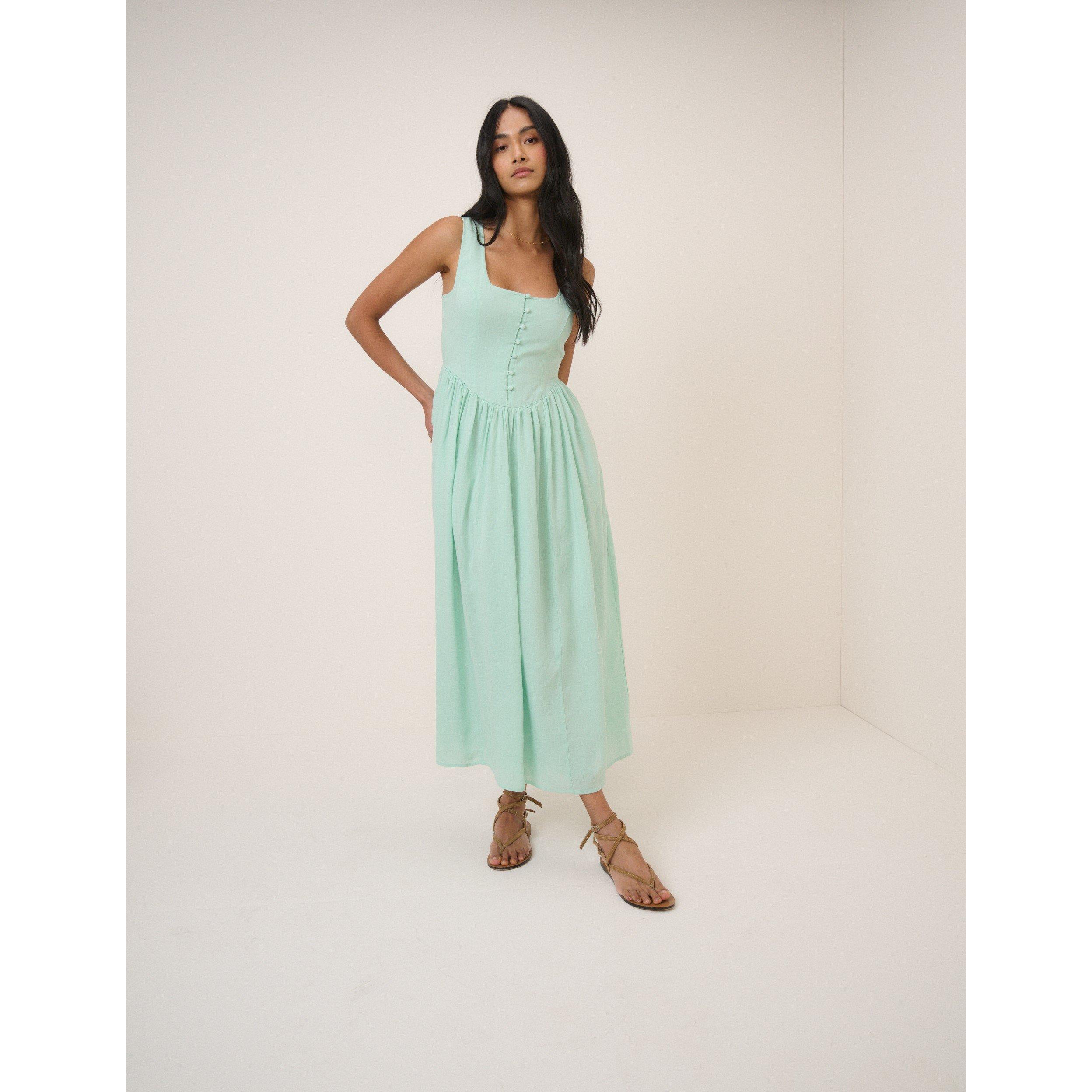Our icon, Cora. This Mint Green midi dress features a square neckline and a corset-inspired bodice with button front detailing. Shaped by a stylish drop waist, it falls into a full A-line skirt.