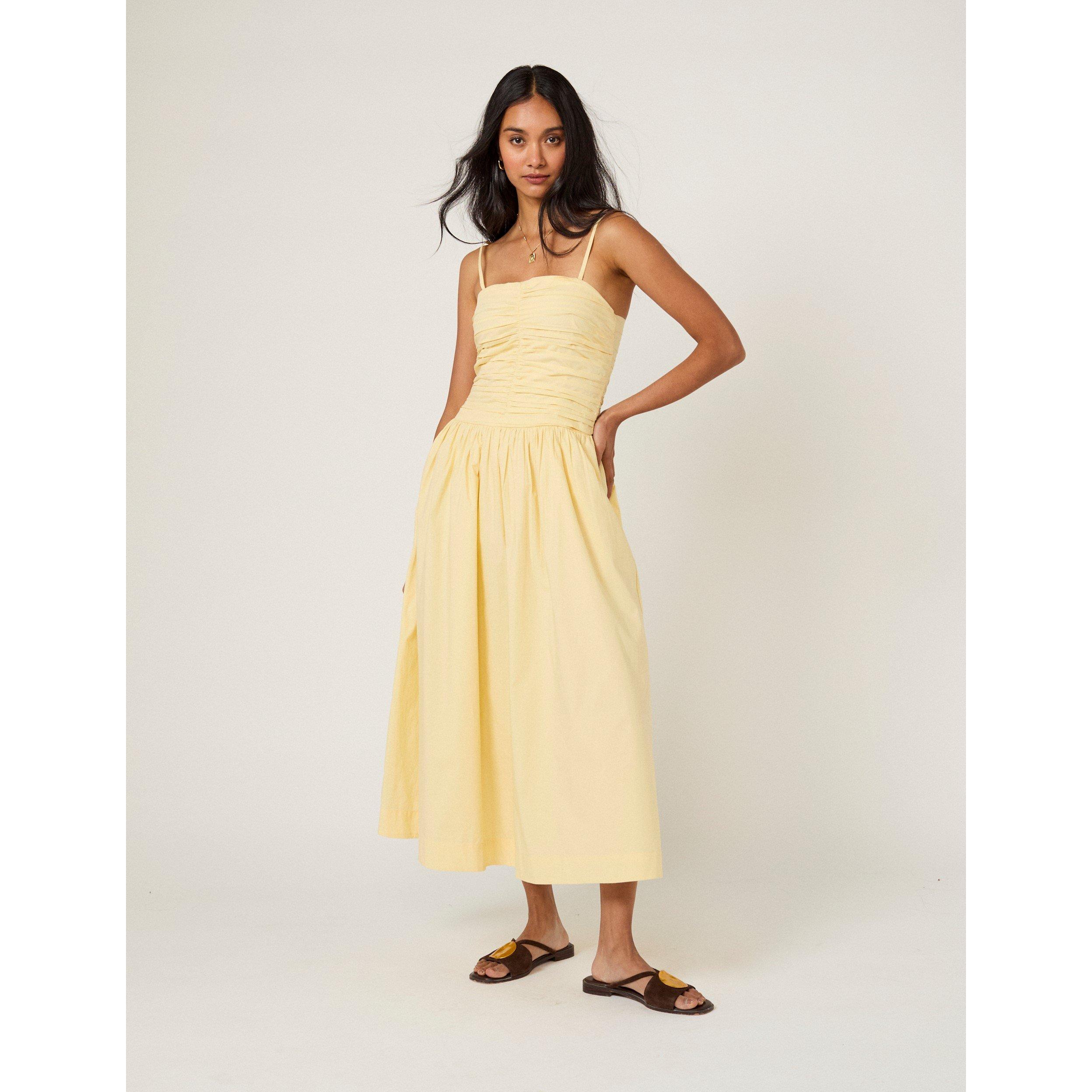 This butter yellow midi dress features a bandeau neckline and optional spaghetti straps. The ruched bodice and shirred back add shaping before it falls to a relaxed skirt.