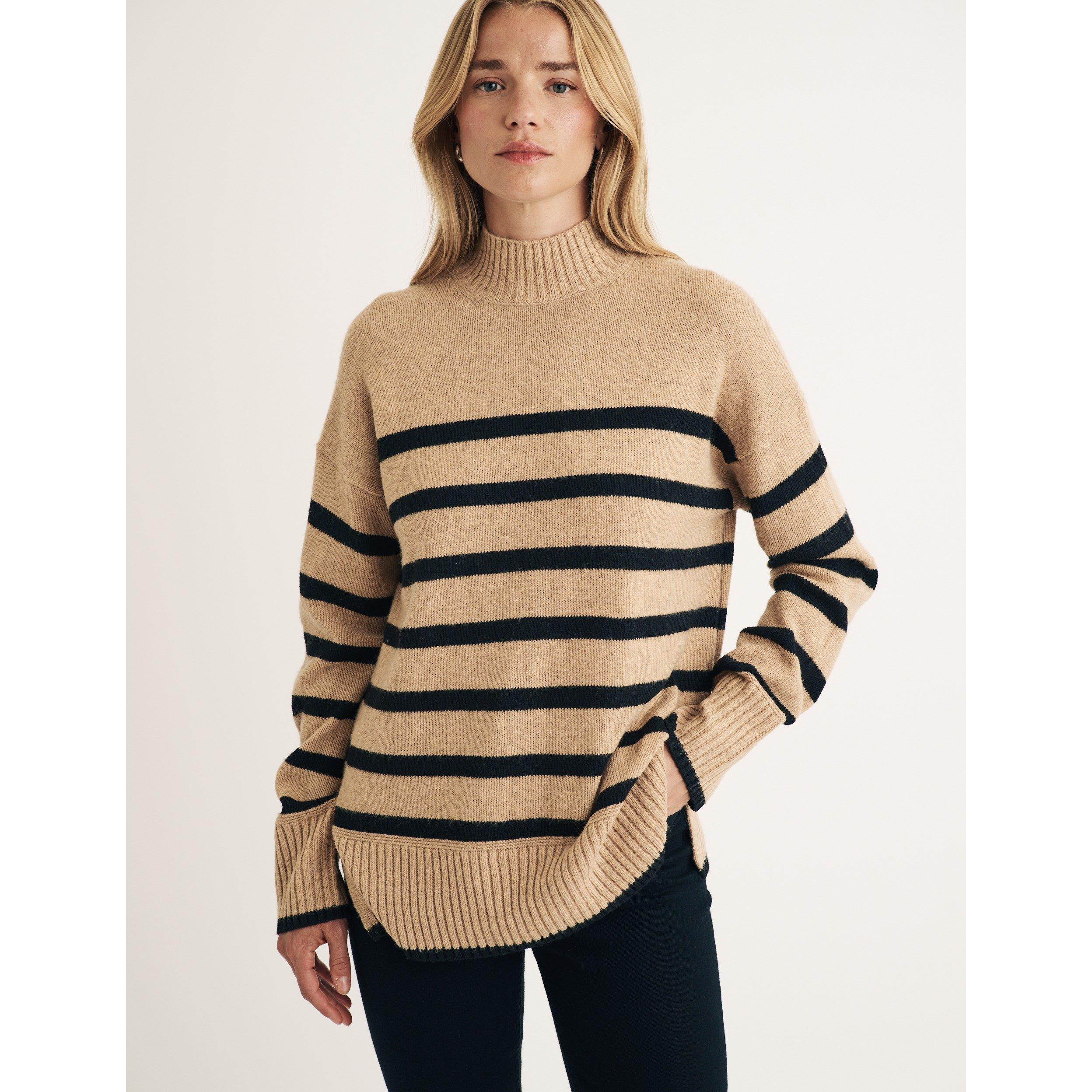 Make a cosy update to your current jumper collection with this beige and black striped layer. Your new go-to number features a funnel neck, voluminous sleeves and ribbed cuffs. Wear with denim or throw-on over your favourite midi.