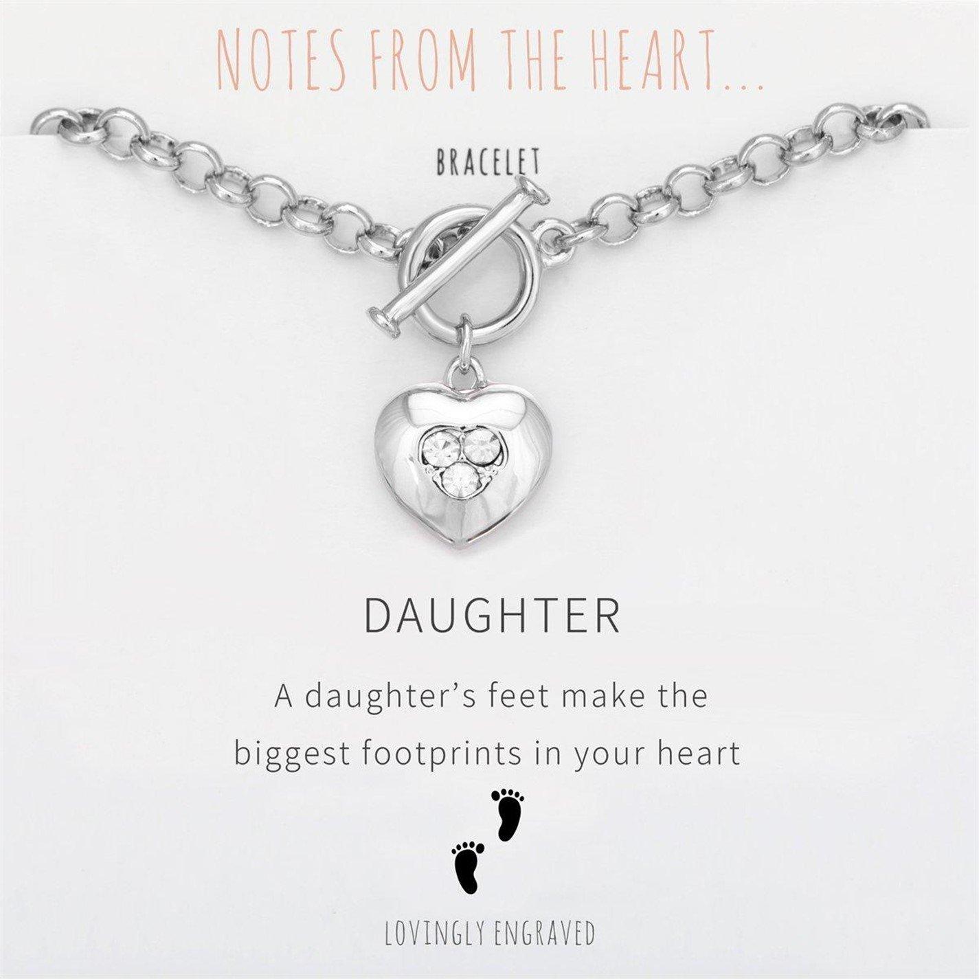 8018 DAUGHTER BRACELET MESSAGE - A daughter's feet make the biggest footprints in your heart. Message delicately engraved on reverse of heart charm. Length 7.25 T bar fitting Presented in a gift bag