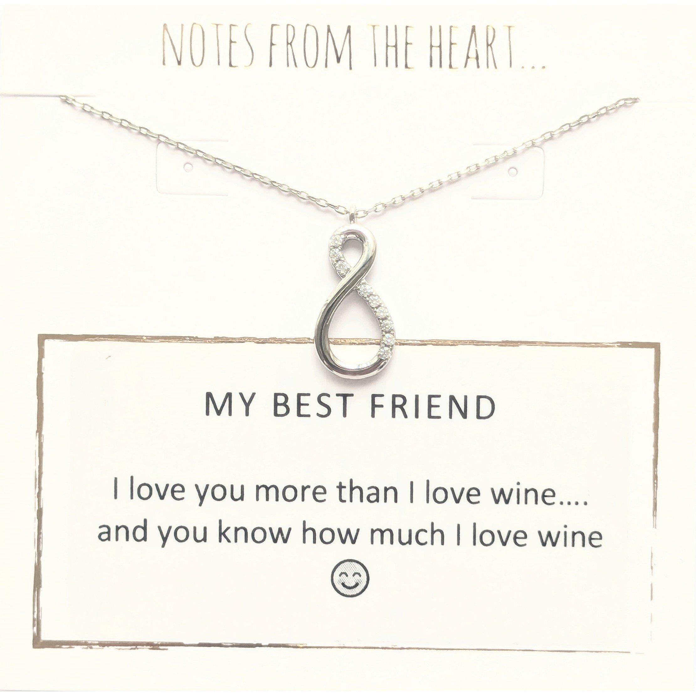 Notes From the Heart My Best Friend Infinity Pendant Message on card reads - I love you more than I love wine....and you know how much I love wine Infinity pendant chain length 18 and includes 2 extender Presented in a gift bag Material: Base Metal