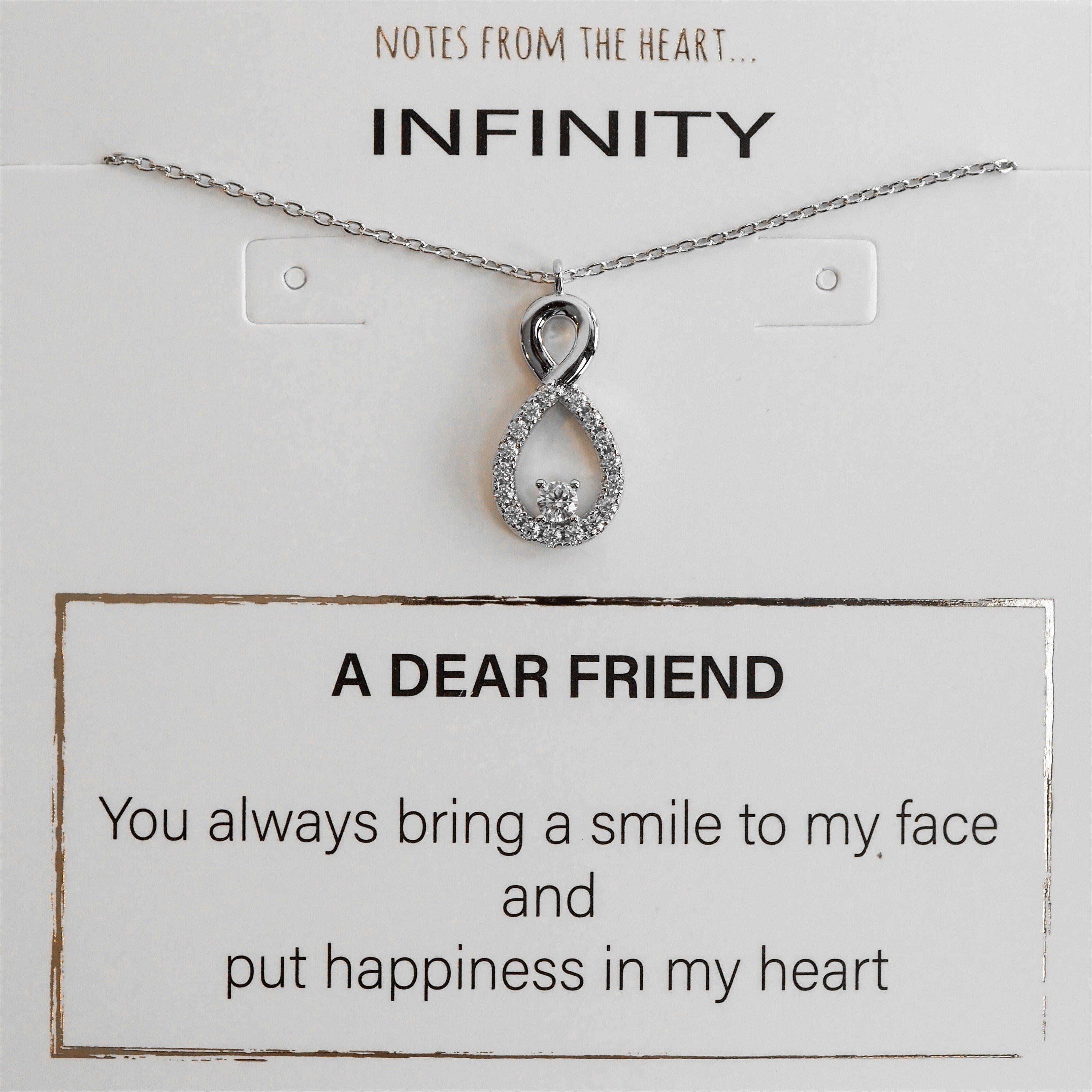 T-08N DF A DEAR FRIEND pendant Message on card reads: You always bring a smile to my face and put happiness in my heart Infinity Crystal Pendant. Chain length 18 plus 2 extender Presented with a gift bag Material: Base Metal