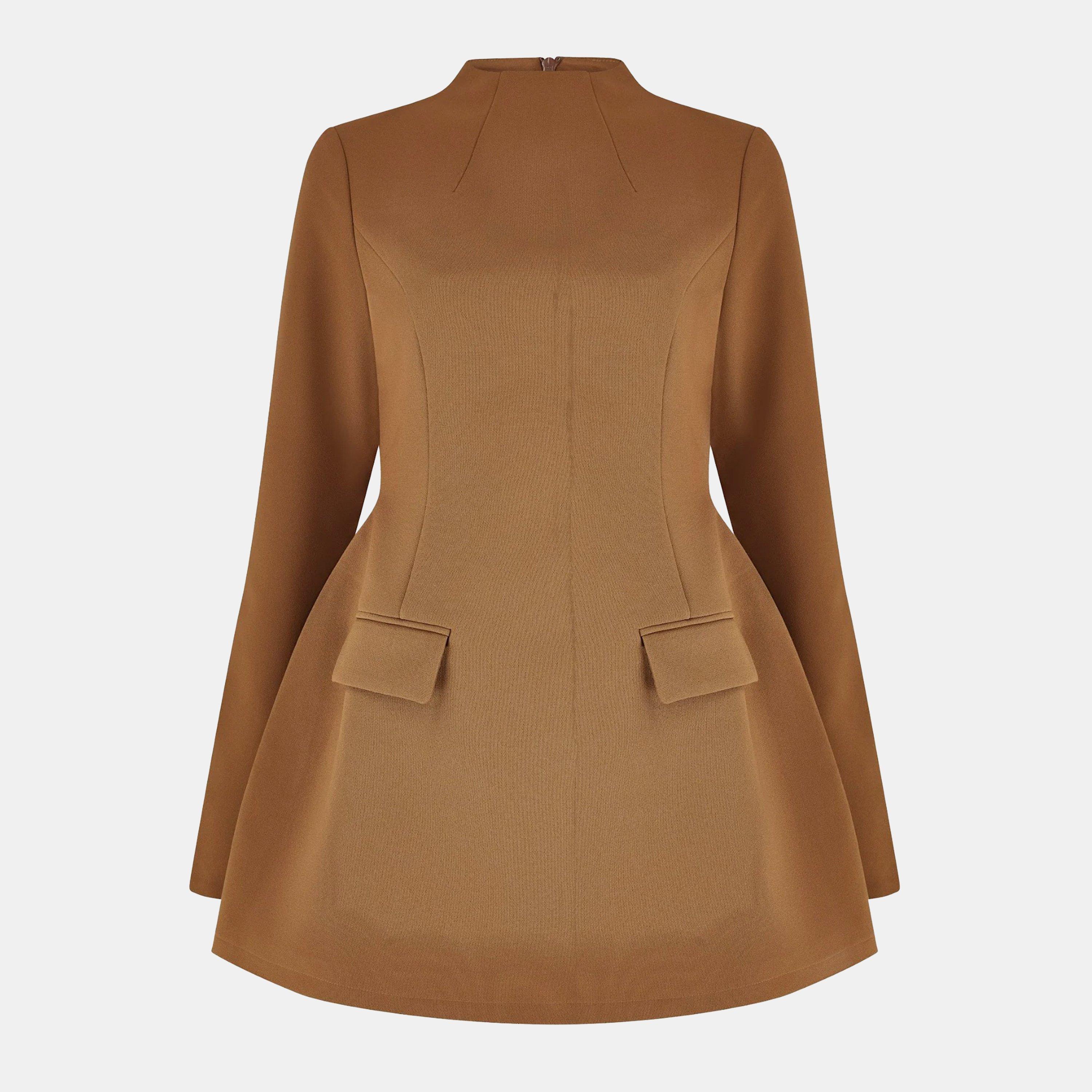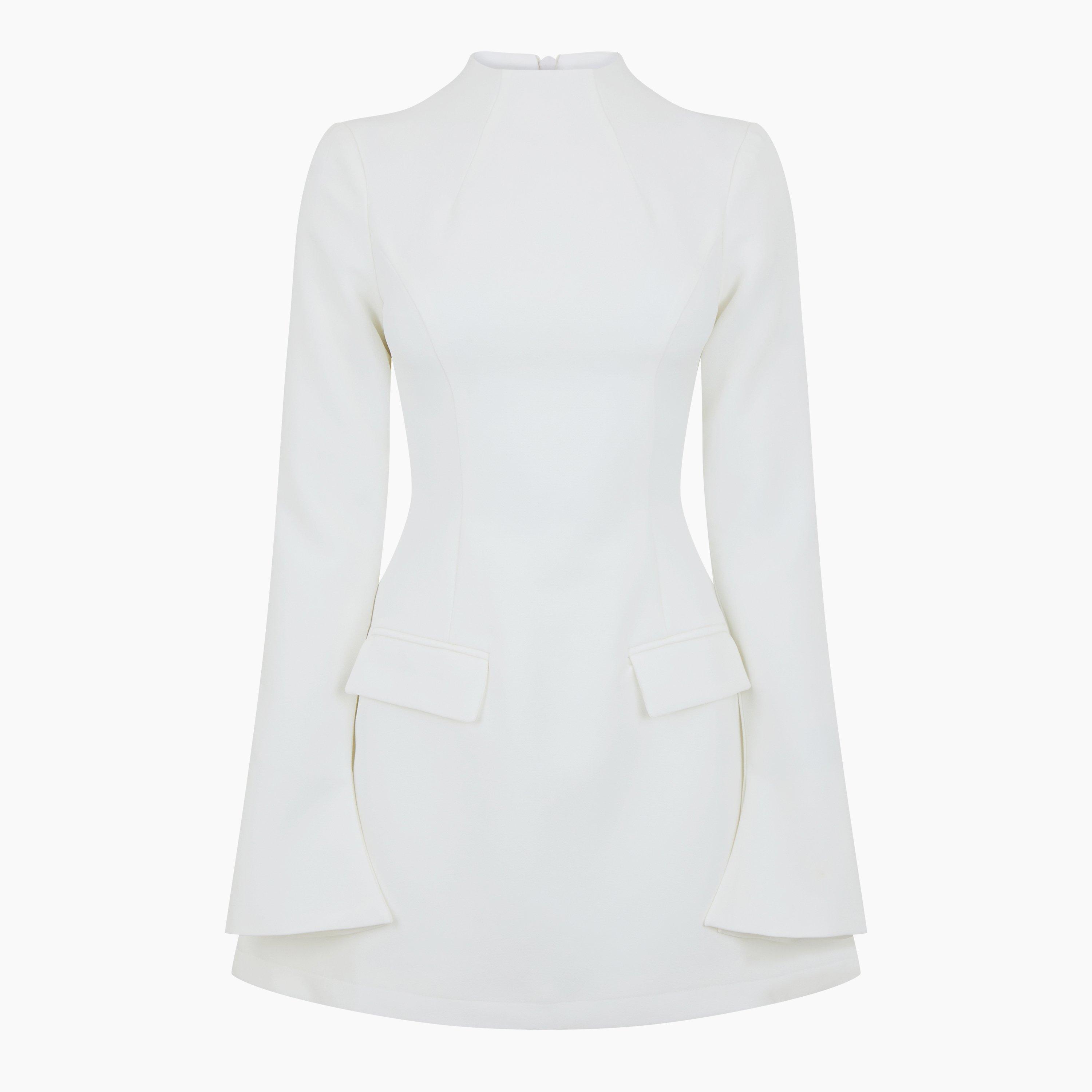 Odd Muse's women's Long Sleeve Mini Dress showcases architectural lines and precise tailoring throughout. Featuring a high neckline and fitted bodice that transitions into a subtly flared skirt, this contemporary design incorporates decorative flap pockets at the waist for structural interest and modern appeal.