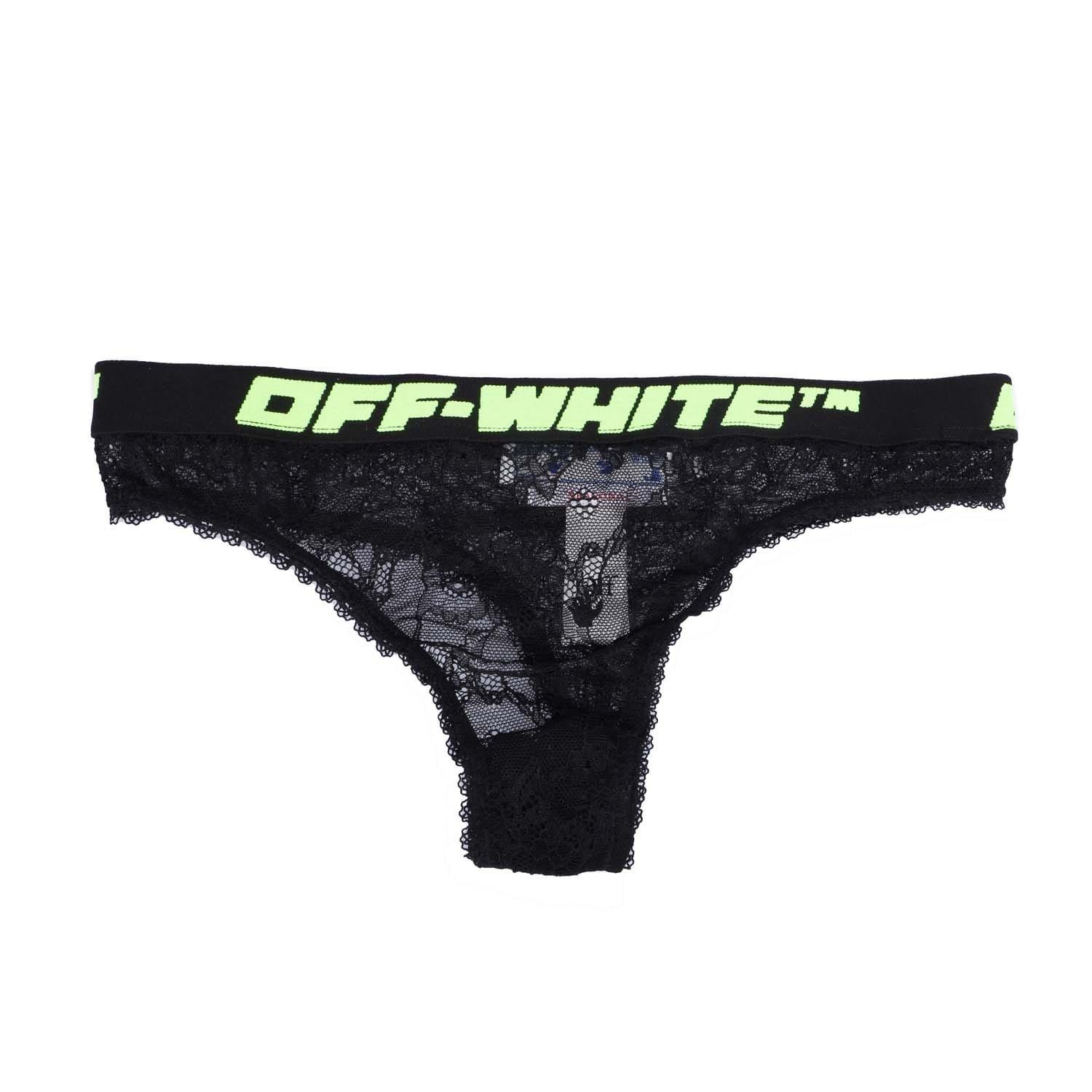 Womens Off White Logo Band Lace Thong in black. - Logo and signature pattern at elasticized hem with yellow script logo. - Tonal stitching. - 90% Polyamide 10% Elastane. - Ref: OWUA0470011000 We regret that underwear is non-returnable due to hygiene reasons.