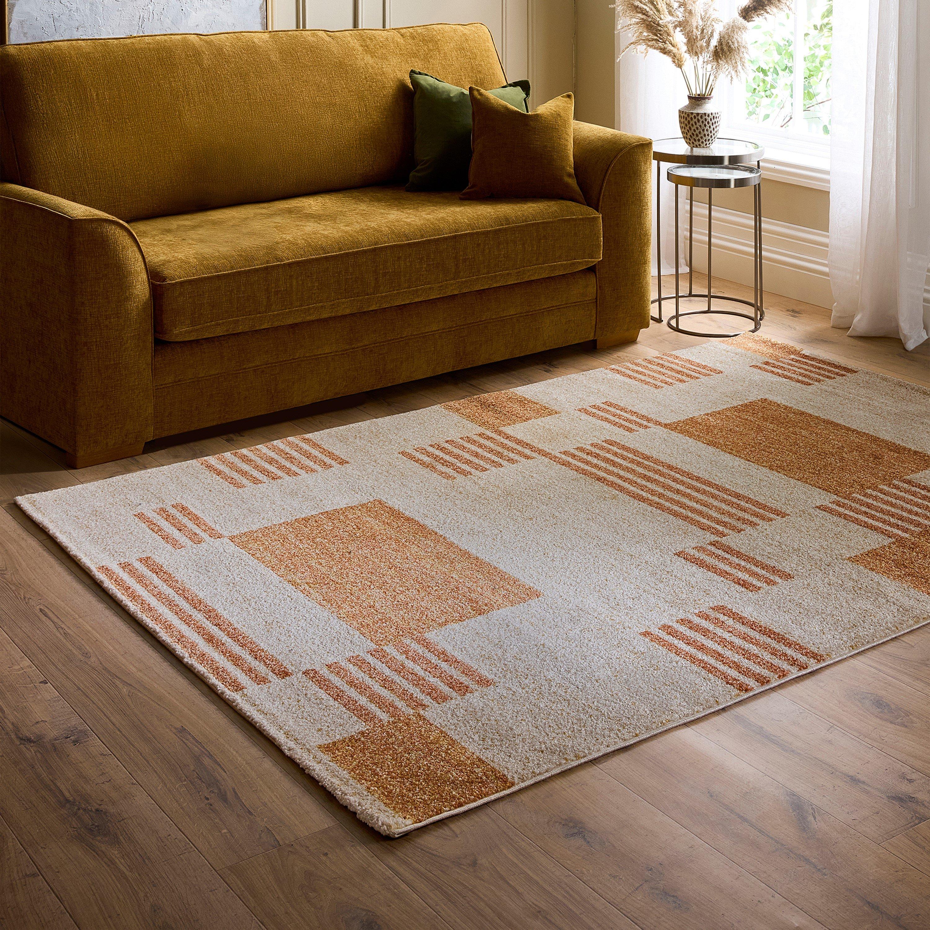 Our Nomad Block design features a repeated abstract striped design in a terracotta colour on a beige background. Made from polypropylene, this rug is hardwearing and made for busy homes.