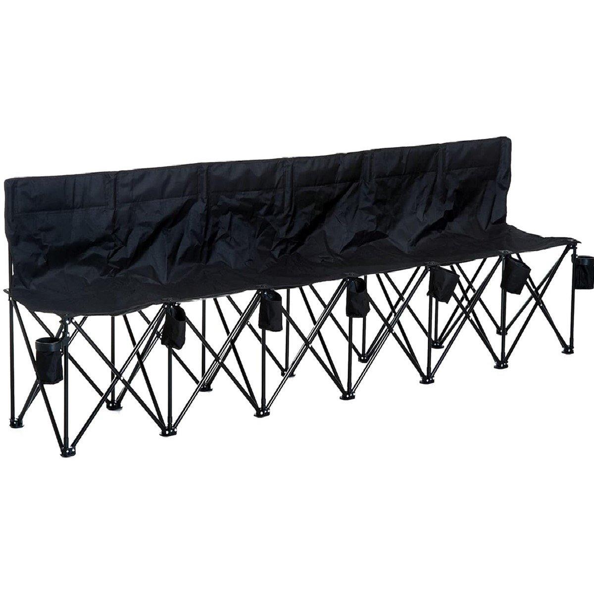 Features: Comes in 6 seater combination Folds up easily, neatly and conveniently Connected nylon seats with collapsible metal frames Each seat has 114 kg weight capacity Including a carry case made from tough 600D nylon Great for outdoor team activities, such as football, camping, baseball, etc The left and right cup holders can be removable, while the middle five can not Specification: Colour: Black Material: Metal, Oxford Fabric Overall Dimension: 259L x 48D x 80H cm Backrest Height: 37 cm Seat Height: 43 cm Cup Holder Diameter: 9 cm (left and right), 8 cm (middle) Folding Dimension: 41L x 14W x 80H cm Weight Capacity: 114 kg (single seat) Item Label: 84B-066 Package Includes: 1 x Camping Chair 1 x Manual