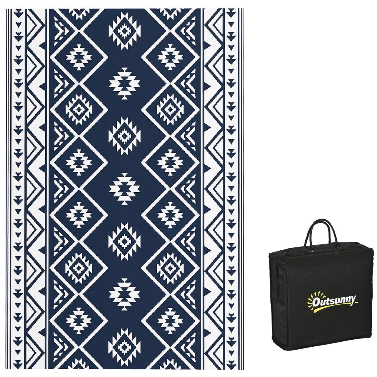 Features: Reversible with double sides for varied use Made of polypropylene, with a protective coating to help prevent fading and sun damage Features robust edging to prevent fraying Space-saving foldable design for easy storage and transport Carry bag included Versatile for camping, picnics, RV road tours and more Specification: Style: Geometric Colour: Dark Blue and White Material: 310g/m² PP, Woven Fabric Overall Size: 182 x 274cm Thickness: 0.3cm Carry Bag Size: 39L x 37.5W x 15Hcm Item Label: 844-789V00MX Note: This garden carpet is not fireproof, please keep it away from fire. Package Includes: 1 x Outdoor Rug 1 x Carry Bag