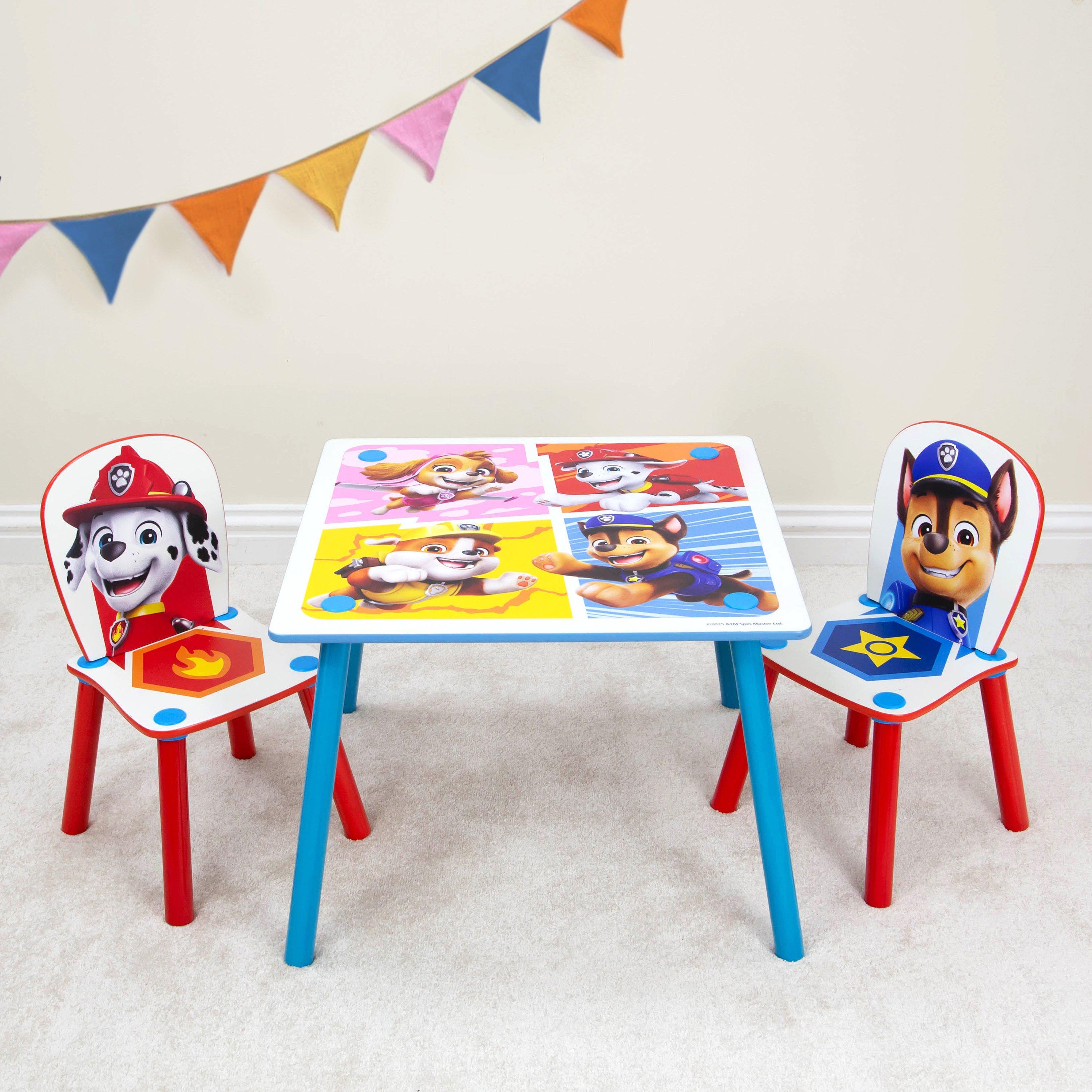 Heroic, brave and colourful, Paw Patrol is loved by children around the world, inspiring play and inclusion from a young age. Our officially licensed Paw Patrol table and chair set includes a square table with 2 toddler sized chairs. The tabletop features a high quality print of the Paw Patrol gang, including Chase, Skye, Rubble and Marshall, while one of the chairs features Chase with his badge on the back rest and seat, and the other has Marshall with his badge. Thanks to its wipe clean surface the table set is versatile enough to be used for arts and crafts, painting, drawing, and for your young one to practice their writing or reading. They can also eat and drink at the table without fear or damaging the surface. The table and chair set is easy to assemble, with all the fittings included and has step by step instructions. The MDF is high quality and durable, while the chairs are light enough for your child to put away after use. Suitable for ages approximately 18 months to 5 years, when assembled the table measures 45cm x 63cm x 63cm (HxDxW) and the chairs measure 52.5cm x 29.5cm x 29cm (HxWxD).