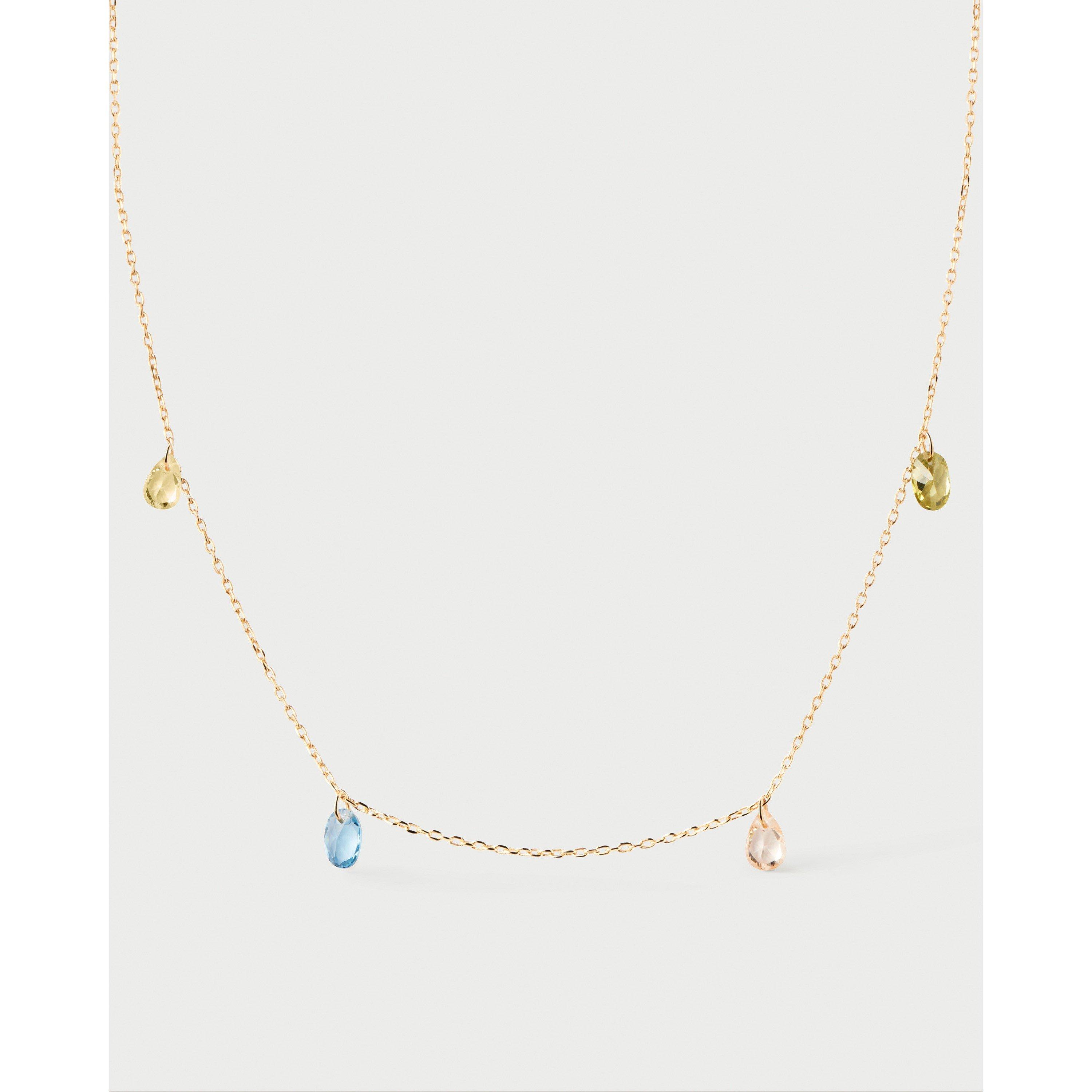 Material: Sterling Silver (80% recycled silver) Finishing: 18K Gold plating Stones: Olive green zirconia, Peach zirconia, Sky Blue zirconia, Lime green zirconia Chain length: Adjustable clasp from 400 to 500 mm Stone measurements: 6 mm Weight: 2.13 g