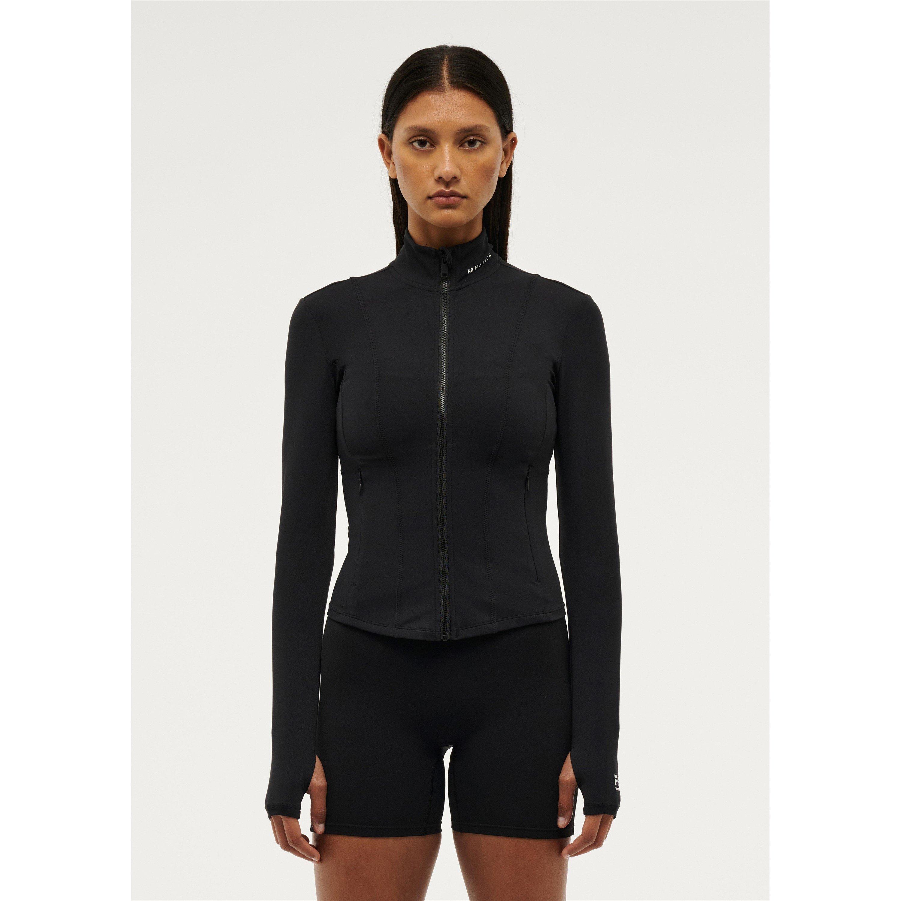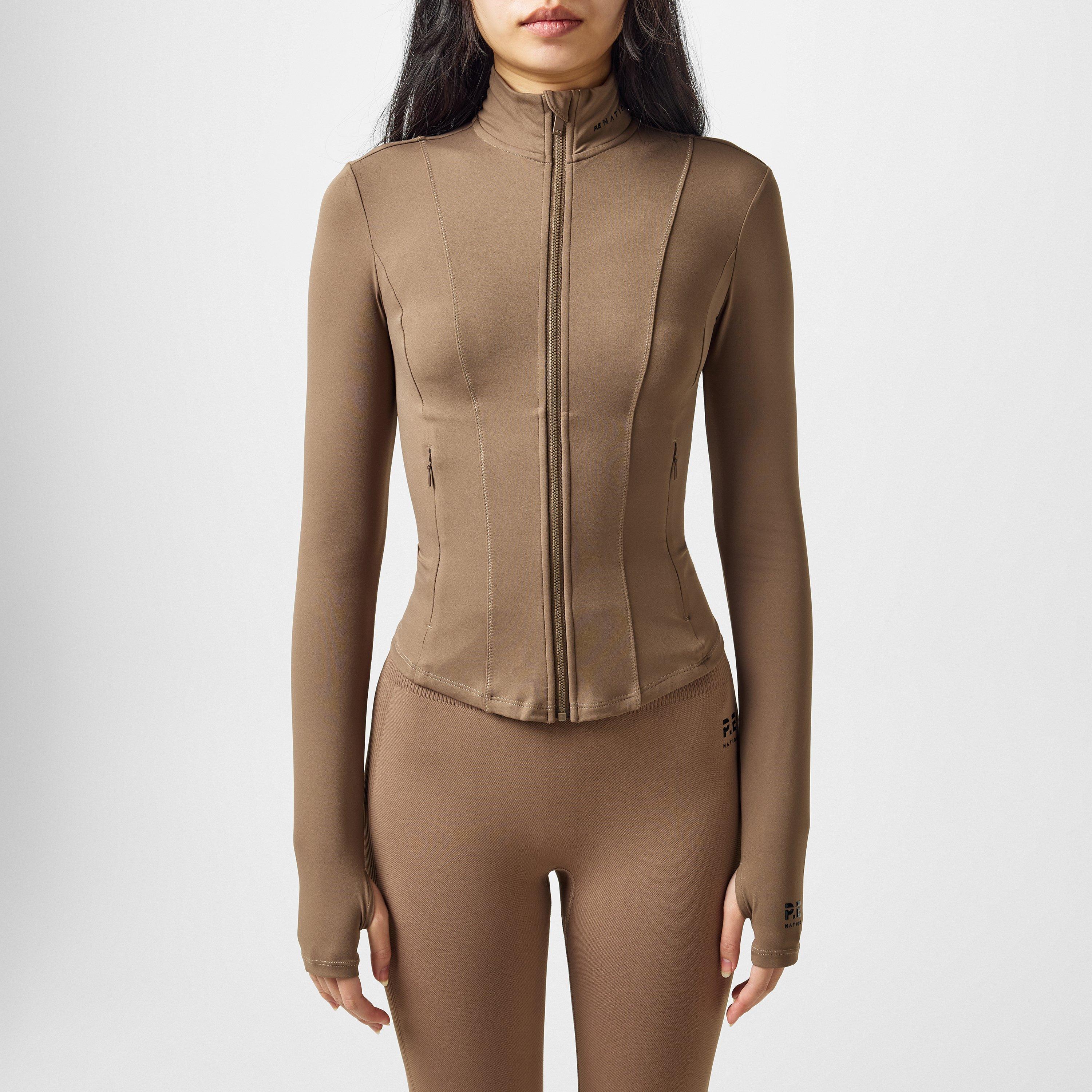 PE Nation's Breakthrough Long Sleeve Jacket delivers performance-focused activewear design with thoughtful details. This slim-fit training piece features a zip-down front with funnel neck collar, practical thumb holes, and zigzag stitching that adds structural interest for sport and gym activities.