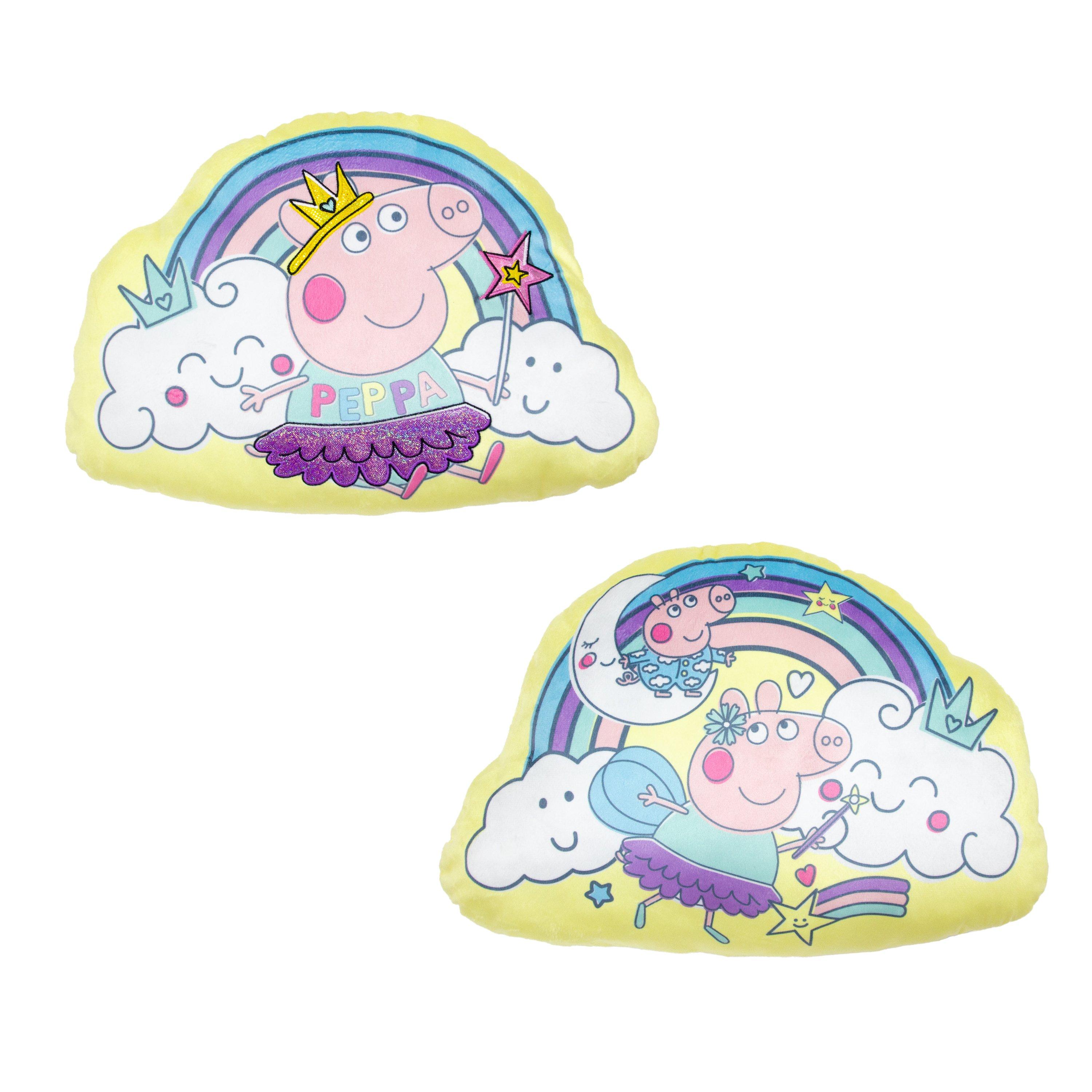 Loved by children of all ages, Peppa Pig is colourful, fun, and a great role model. This officially licensed Peppa Pig reversible cushion features a print of Peppa as a fairy with an embossed glittery skirt and crown, with a rainbow and clouds and set on a yellow background. The reverse side features Peppa with George riding on the moon, with shooting stars and a rainbow. The shaped Peppa Pig cushion is made from a strokably soft, snuggly material and is plump enough to be used as a practical cushion, not just a decoration. Perfect as a Christmas present or a gift throughout the year for kids or adults alike, and great to brighten up a bedroom, sofa or armchair. It’s packed with padding to support them when they’re gaming in a chair, and comfortable enough to snuggle up on a sofa with on movie night, or even as a fun comforter for young children. The cushion measures approximately 40 x 40cm, and is perfect for any Peppa Pig fan. This Peppa Pig magic fairy shaped cushion makes for a perfect companion accessory to our official Peppa Pig bedding set or fleece blanket.