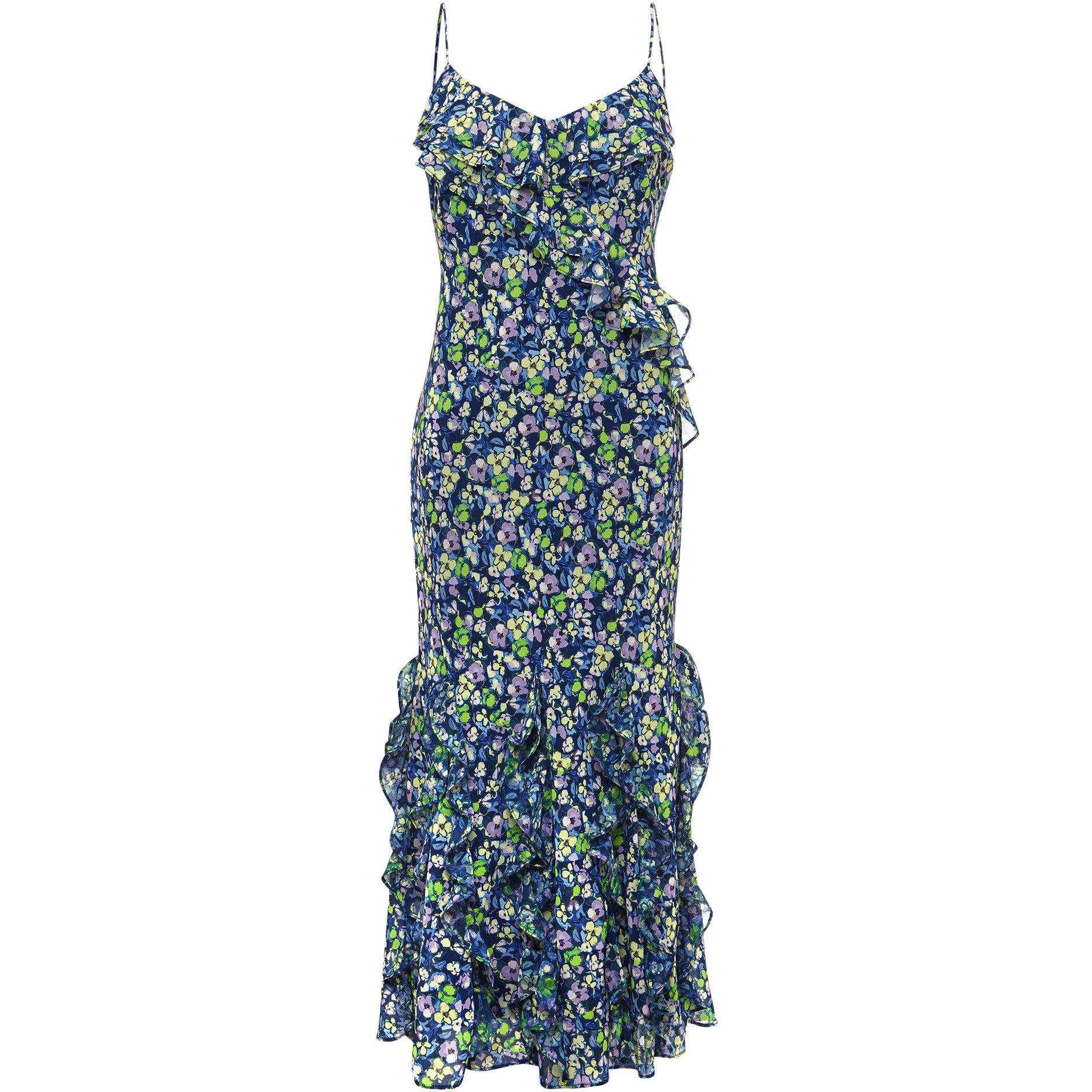 Make a statement with this floral dress. Designed with a beautiful blue floral print our Catira dress features delicate straps and a ruffled skirt. We’ve styled ours with purple heels and a matching clutch bag to bring the final look together.