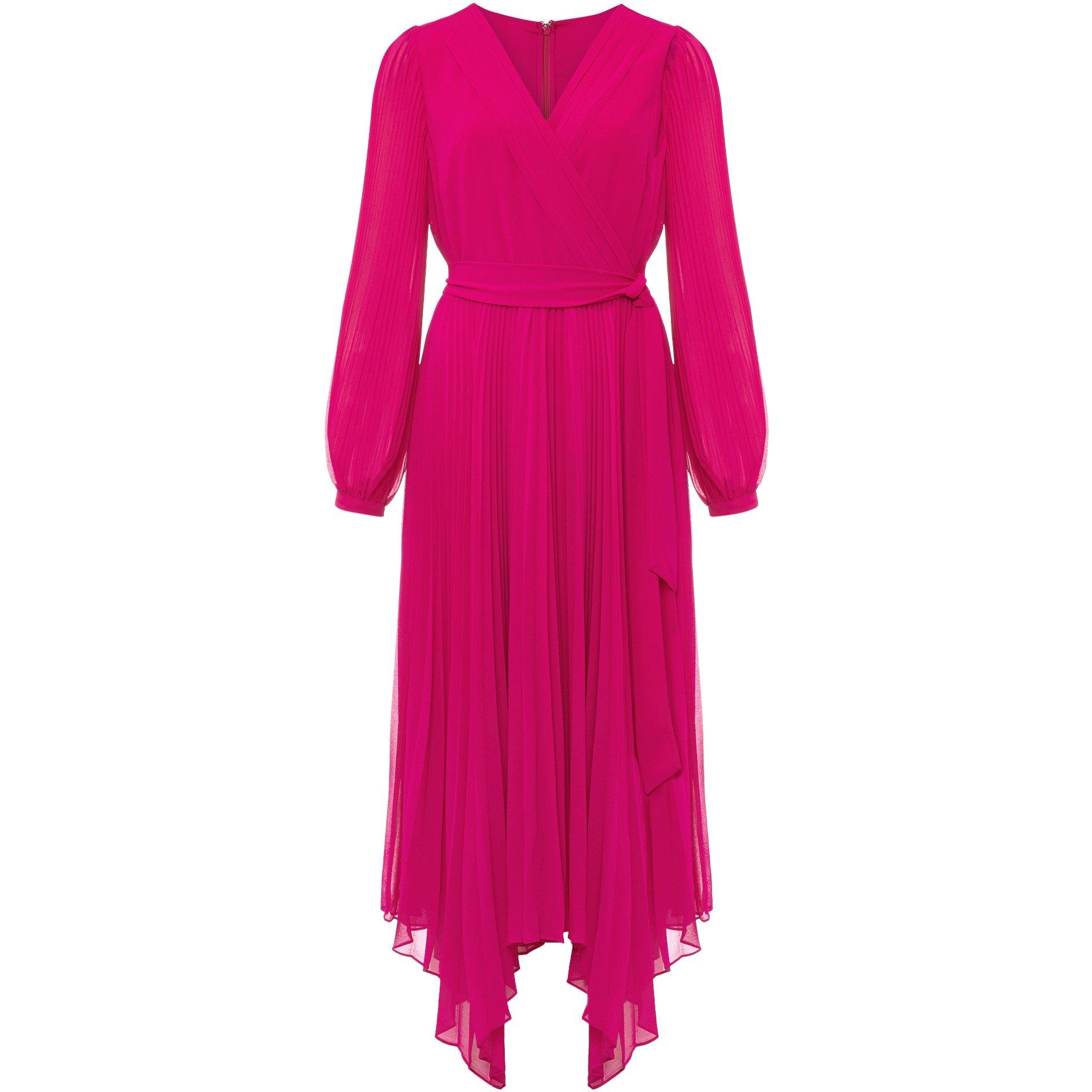 Effortlessly elegant our Petra dress showcases a beautiful cherry pink shade with delicate pleated high low skirt that creates wonderful movement as you walk. The perfect option for wearing to your next special occasion.