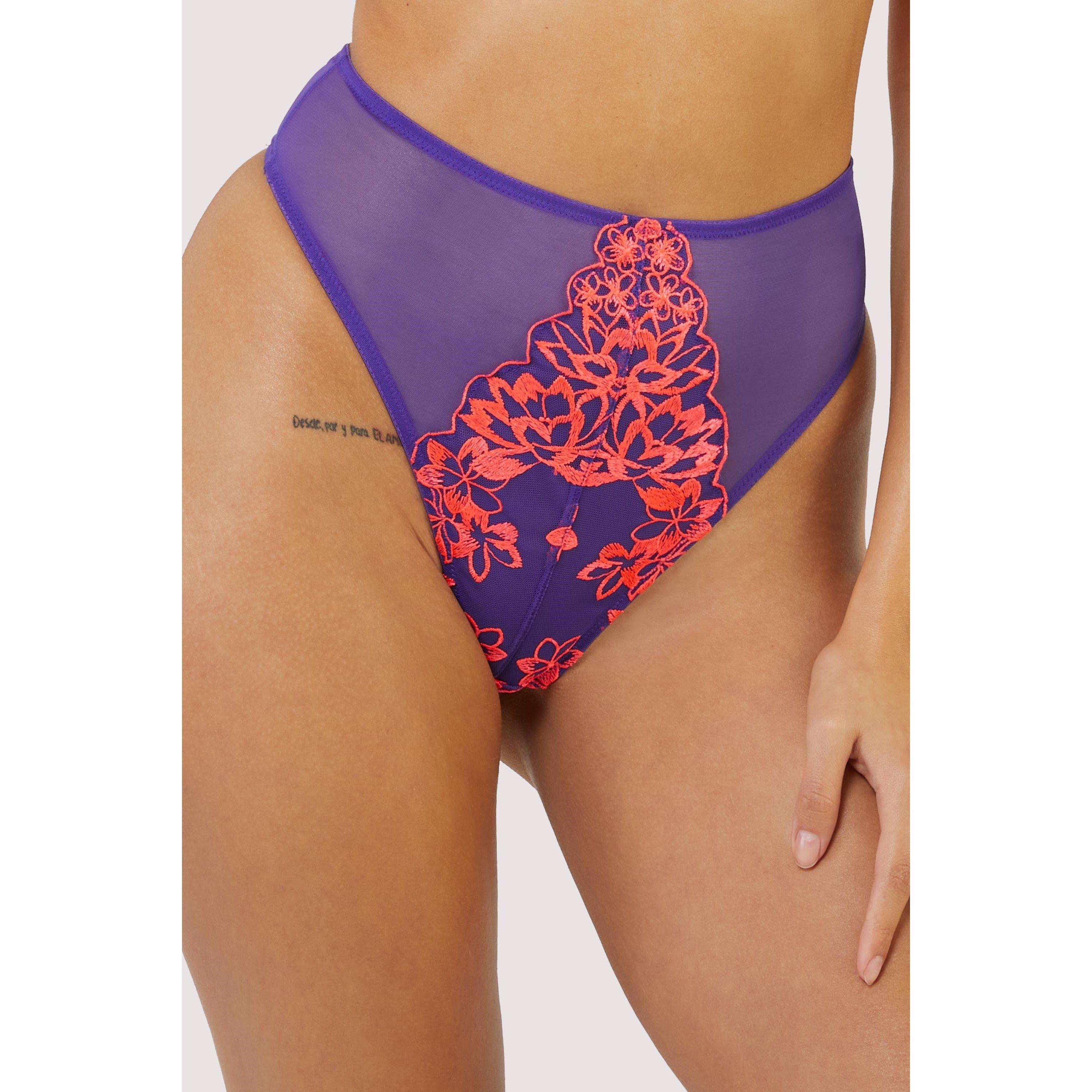 Purple and Neon Pink Embroidery High Waist Thong Elasticated Waist High Waist Thong Sheer mesh back