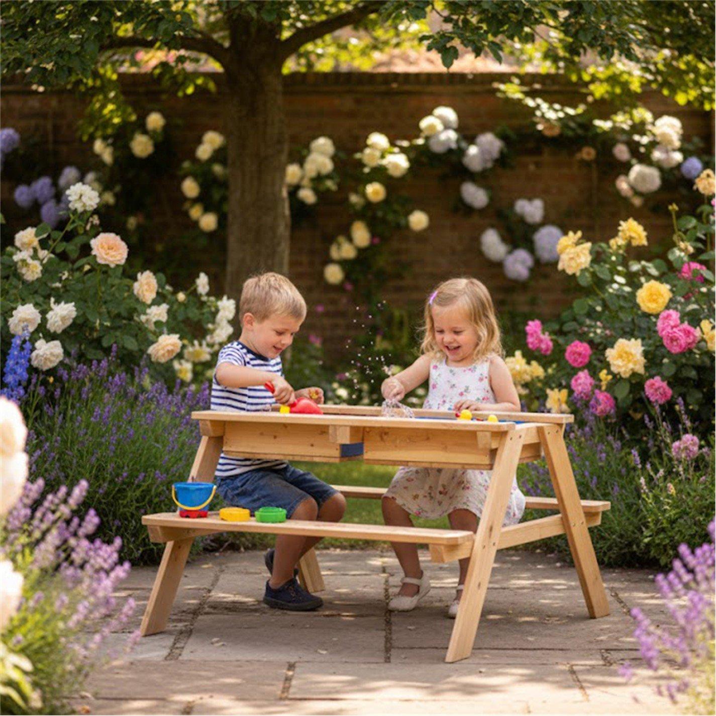 The Surfside Sand and Water Table from Plum® is the perfect multifunctional item for your garden! Whether it’s building sandcastles, creating mini rafts or making pieces of art through crafting, the table has something to keep children busy for hours. This versatile bench can be used as a picnic table for outdoor eating or for playing games. If you lift the centre wooden panel, you’ll find a sandpit and water compartment nearly contained within the base of the table. Let their creativity run wild by digging and splashing in the sand and water. Plenty of room for encouraging fun, social play with friends and family. Made from FSC® certified sustainably sourced timber, with rounded corners and edges for added safety. This multi-purpose table takes up a small footprint in your outdoor space; ideal for compact gardens or patios.