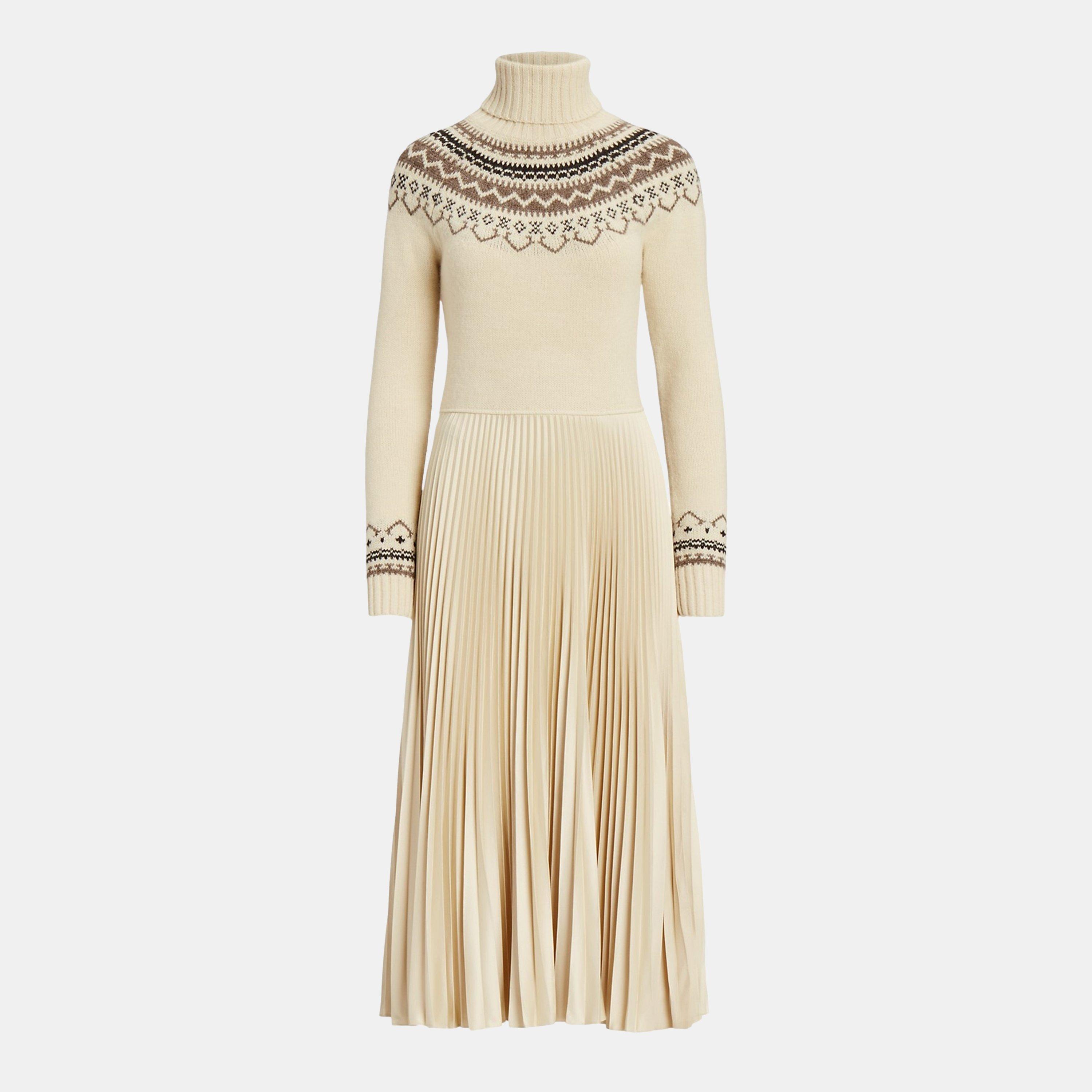 Step into a world where elegance and creativity intertwine with the Polo Ralph Lauren Bluen intarsia-knitted dress. Inspired by the artistry of coordinating separates, this dress is a true masterpiece that seamlessly combines comfort and style. The intarsia-knit top, reminiscent of a timeless Fair Isle sweater, captures the essence of heritage and adds a touch of artistry to the ensemble. As the eye travels down, it is met with a flowing maxi skirt crafted from recycled crepe de chine, pleated to create a captivating movement with every step. Slip effortlessly into this dress, appreciating the ease and comfort it offers. The long sleeves, crew neckline, and seamless stitches are a testament to Polo Ralph Lauren's dedication to exceptional craftsmanship. Designed to be breathable, this dress is perfect for any season or occasion, providing a luxurious and comfortable option for the fashion-forward individual. 42% wool, 30% acrylic, 24% alpaca, 3% other fibers, 1% elastane. Machine washable, follow care instructions.