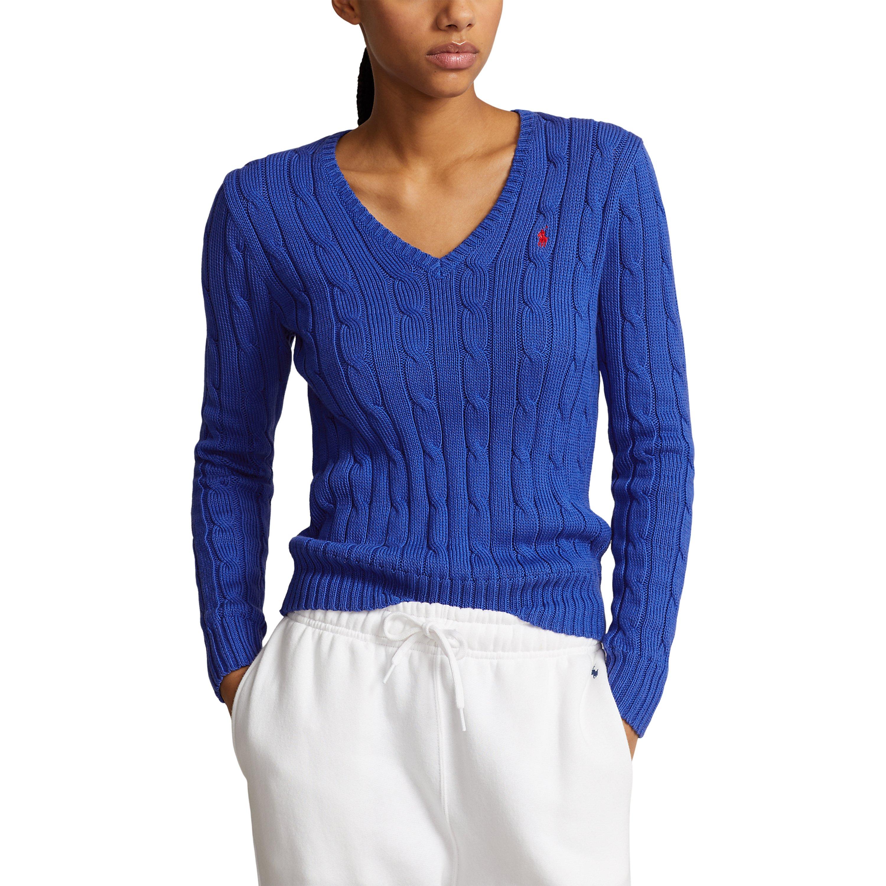 Timeless cable-knit patterns define this impeccably crafted Polo Ralph Lauren jumper. A classic V-neckline frames the design while the signature pony embroidery adds that distinctive mark of quality. The long sleeves and ribbed trims create a figure-flattering silhouette that works seamlessly with both casual and smart attire.